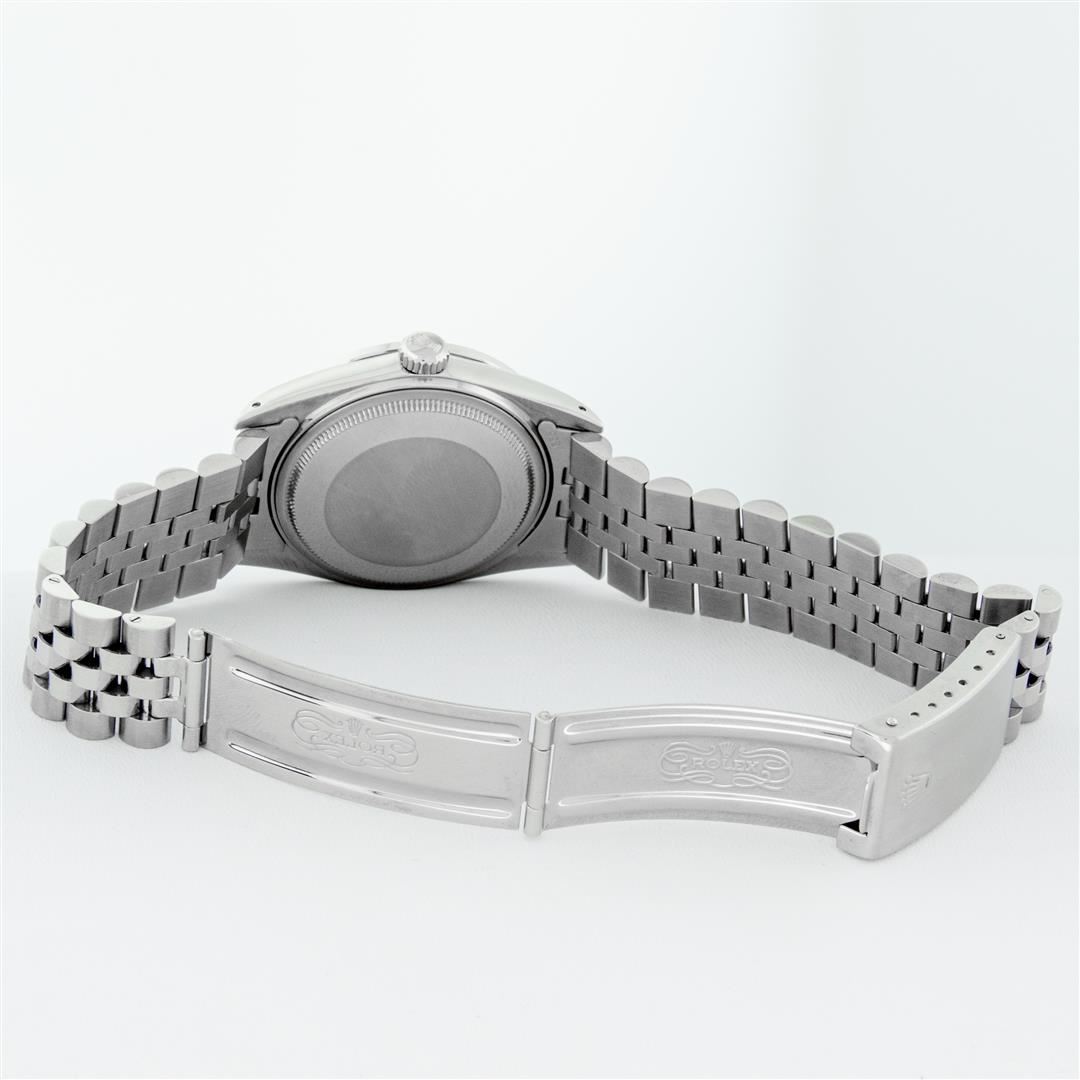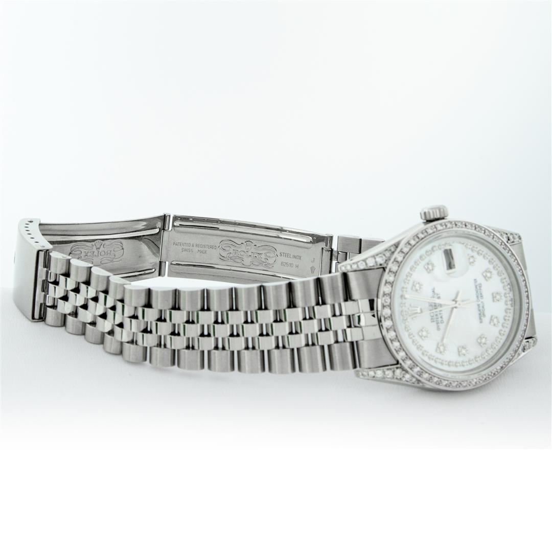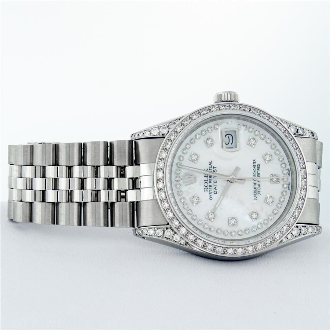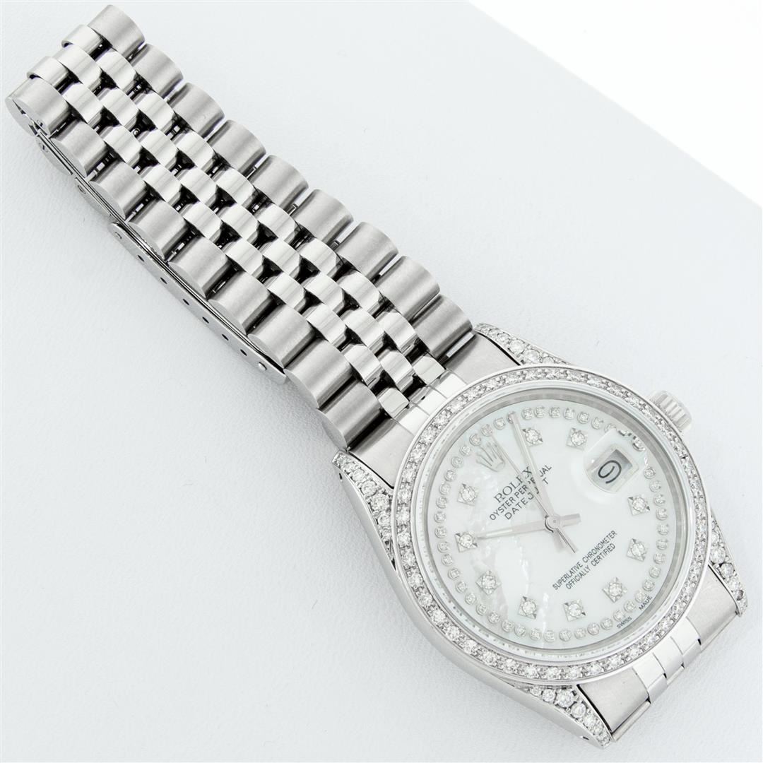One Mens Rolex Datejust Polished Bright with Satin Finish, Serviced & Electronically Tested, Stainless Steel Case: 36mm, Custom Diamond Lugs: 28 Diamonds In Lugs, Color: G to H, Clarity: SI-VS. Stainless Steel Crown, Custom Bezel: 18K White Gold Diamond Beadset Bezel, Diamond Count: 44 Diamonds, Total Weight 1.00 Carat, Clarity: SI-VS, Color: G to H. Custom Crystal: New Scratch Resistant Synthetic Sapphire Cyclops Lens. Custom Hands: New Luminescent Hands. Movement: Automatic Winding Movement. Custom Dial: Mother Of Pearl String Single Cut Diamond Dial, Stone Count: 58 Diamonds In Dial, Diamond Color: G To H In Color, Clarity: VS. Date Window: 3 O'Clock Position Date Display, Quickset, Model: Datejust Condition: G-6 Extra Fine. Bracelet: Stainless Steel Jubilee Band. Bright Polish & Satin Finish. 7.0 Inch Length, Adjustable. Standard Clasp, With Rolex Logo. This Watch Has Been Serviced And Polished And Its Free Of All Dents And Scratches.
