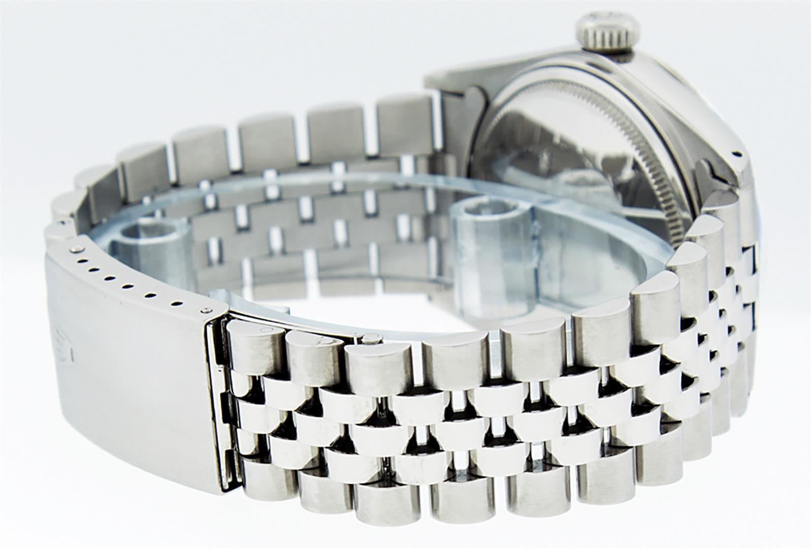 One Mens Stainless Steel Rolex Datejust Polished Bright with Satin Finish, Serviced & Electronically Tested, Stainless Steel Case: 36mm, Stainless Steel Crown, Original Bezel: 14K White Gold Fluted Bezel. Custom Crystal: New Acrylic Cyclops Lens. Custom Hands: New Luminescent Hands. Movement: Automatic Winding Movement. Custom Dial: Mother Of Pearl Ruby String Diamond Dial, Stone Count: 10 Rubies + 48 Diamonds in Dial, G To H In Color, SI-VS Clarity. Date Window: 3 O'Clock Position Date Display, Quickset, Model: Datejust, Condition: G-6 Extra Fine. Bracelet: Stainless Steel Jubilee. Bright Polish & Satin Finish. 7.0 Inch Length, Adjustable. Standard Clasp, With Rolex Logo. Watch Has Been Serviced And Polished It Is Free Of All Scratches And Dents.