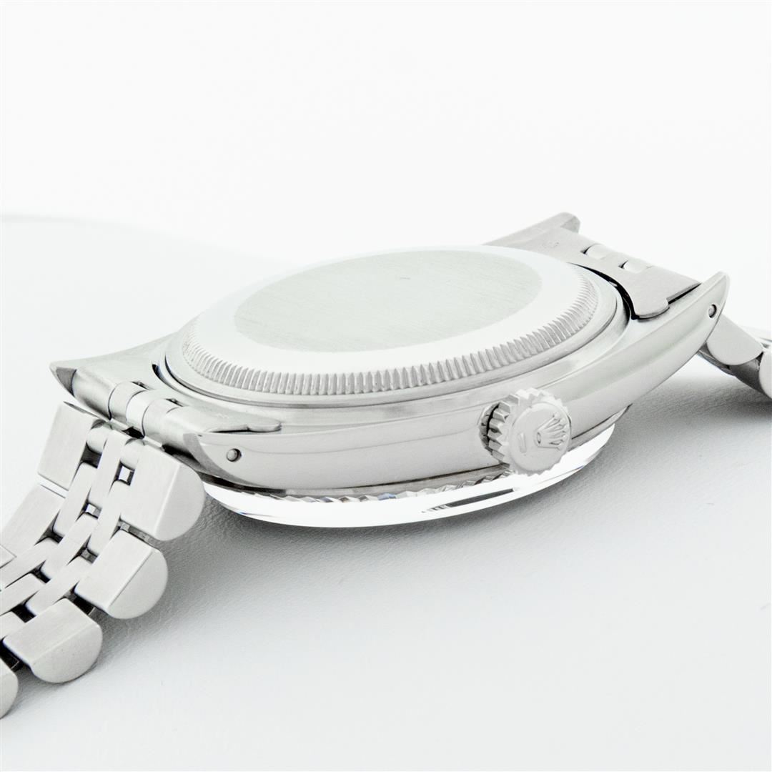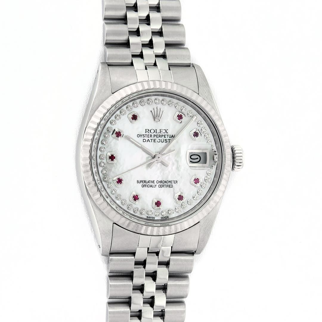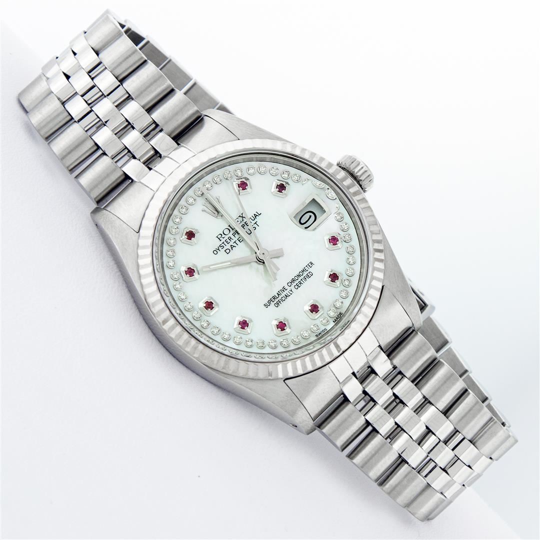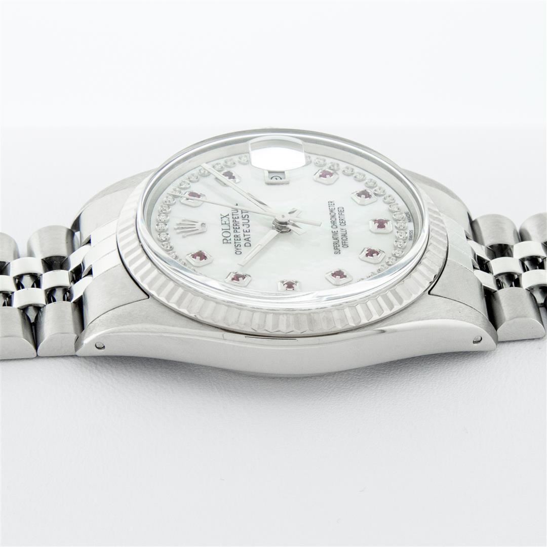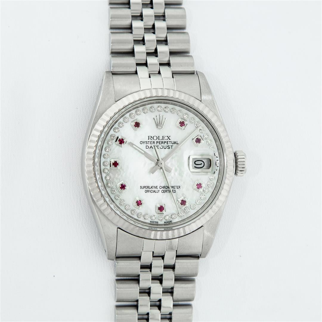 One Mens Stainless Steel Rolex Datejust Polished Bright with Satin Finish, Serviced & Electronically Tested, Stainless Steel Case: 36mm, Stainless Steel Crown, Original Bezel: 14K White Gold Fluted Bezel. Custom Crystal: New Acrylic Cyclops Lens. Custom Hands: New Luminescent Hands. Movement: Automatic Winding Movement. Custom Dial: Mother Of Pearl Ruby String Diamond Dial, Stone Count: 10 Rubies + 48 Diamonds in Dial, G To H In Color, SI-VS Clarity. Date Window: 3 O'Clock Position Date Display, Quickset, Model: Datejust, Condition: G-6 Extra Fine. Bracelet: Stainless Steel Jubilee. Bright Polish & Satin Finish. 7.0 Inch Length, Adjustable. Standard Clasp, With Rolex Logo. Watch Has Been Serviced And Polished It Is Free Of All Scratches And Dents.