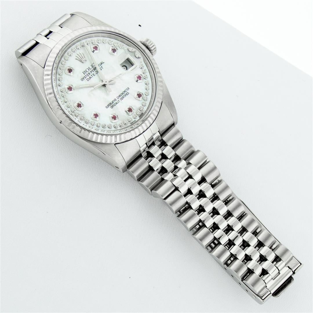 One Mens Stainless Steel Rolex Datejust Polished Bright with Satin Finish, Serviced & Electronically Tested, Stainless Steel Case: 36mm, Stainless Steel Crown, Original Bezel: 14K White Gold Fluted Bezel. Custom Crystal: New Acrylic Cyclops Lens. Custom Hands: New Luminescent Hands. Movement: Automatic Winding Movement. Custom Dial: Mother Of Pearl Ruby String Diamond Dial, Stone Count: 10 Rubies + 48 Diamonds in Dial, G To H In Color, SI-VS Clarity. Date Window: 3 O'Clock Position Date Display, Quickset, Model: Datejust, Condition: G-6 Extra Fine. Bracelet: Stainless Steel Jubilee. Bright Polish & Satin Finish. 7.0 Inch Length, Adjustable. Standard Clasp, With Rolex Logo. Watch Has Been Serviced And Polished It Is Free Of All Scratches And Dents.