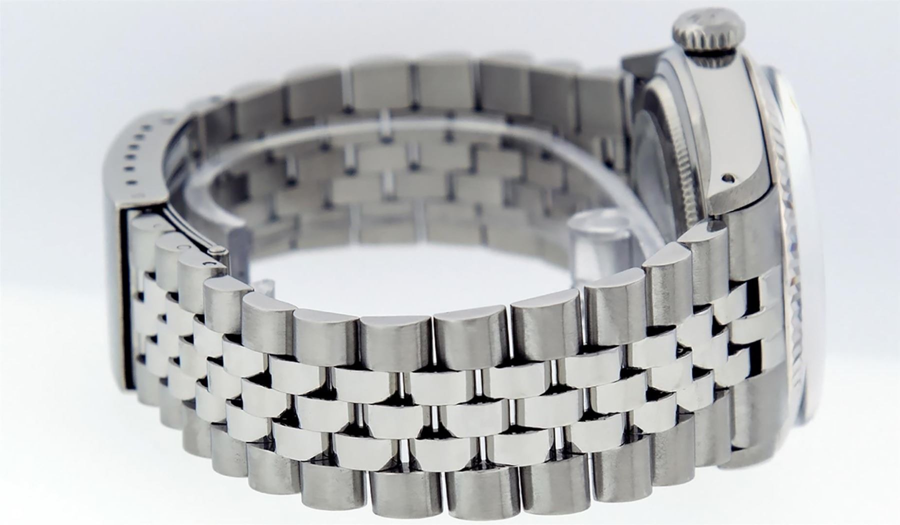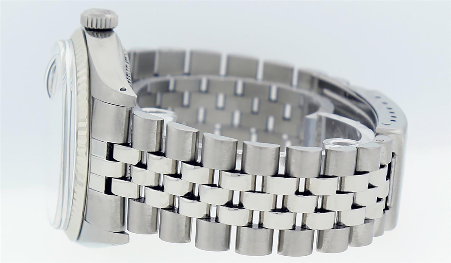 One Mens Stainless Steel Rolex Datejust Polished Bright with Satin Finish, Serviced & Electronically Tested, Stainless Steel Case: 36mm, Stainless Steel Crown, Bezel: 14K White Gold Fluted Bezel. Custom Crystal: New Acrylic Cyclops Lens. Custom Hands: New Luminescent Hands. Movement: Automatic Winding Movement. Custom Dial: Mother Of Pearl Sapphire String Diamond Dial, Stone Count: 10 Synthetic Sapphires + 48 Diamonds in Dial, G To H In Color, SI-VS Clarity. Date Window: 3 O'Clock Position Date Display, Quickset, Model: Datejust, Condition: G-6 Extra Fine. Bracelet: Stainless Steel Jubilee. Bright Polish & Satin Finish. 7.0 Inch Length, Adjustable. Standard Clasp, With Rolex Logo. Watch Has Been Serviced And Polished It Is Free Of All Scratches And Dents.
