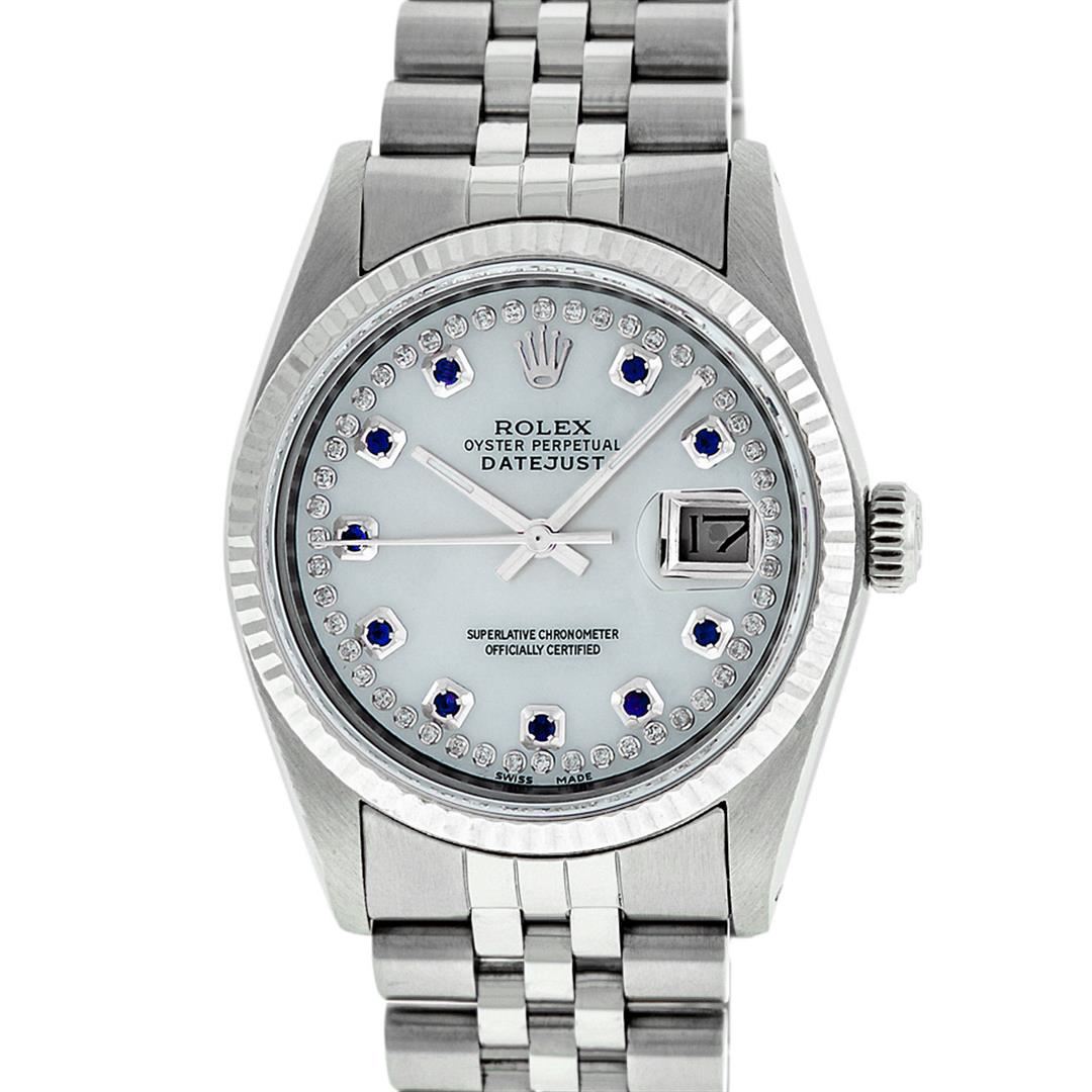One Mens Stainless Steel Rolex Datejust Polished Bright with Satin Finish, Serviced & Electronically Tested, Stainless Steel Case: 36mm, Stainless Steel Crown, Bezel: 14K White Gold Fluted Bezel. Custom Crystal: New Acrylic Cyclops Lens. Custom Hands: New Luminescent Hands. Movement: Automatic Winding Movement. Custom Dial: Mother Of Pearl Sapphire String Diamond Dial, Stone Count: 10 Synthetic Sapphires + 48 Diamonds in Dial, G To H In Color, SI-VS Clarity. Date Window: 3 O'Clock Position Date Display, Quickset, Model: Datejust, Condition: G-6 Extra Fine. Bracelet: Stainless Steel Jubilee. Bright Polish & Satin Finish. 7.0 Inch Length, Adjustable. Standard Clasp, With Rolex Logo. Watch Has Been Serviced And Polished It Is Free Of All Scratches And Dents.