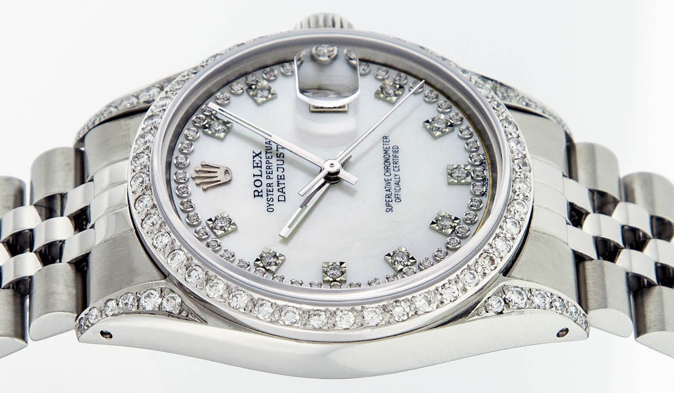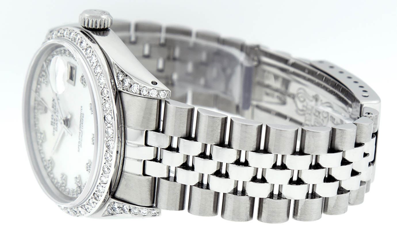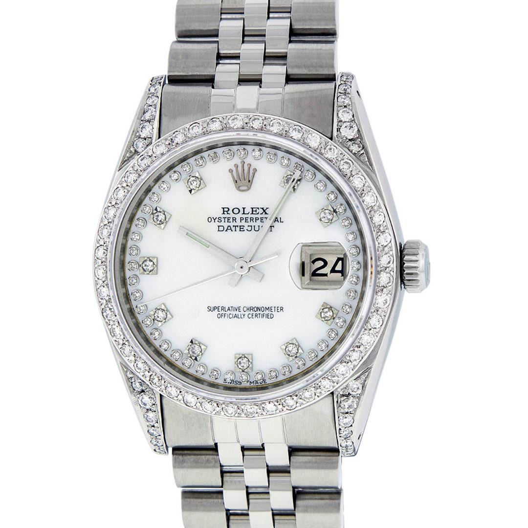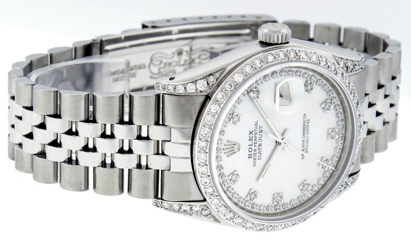 One Gents Rolex Datejust Polished, Serviced & Electronically Tested, Stainless Steel Case:36mm, Stainless Steel Crown, Custom Bezel: 18K White Gold Beadset Diamond Bezel, Diamond Count: 44 Diamonds. Total Weight 1.0 Carat, Clarity: SI-VS, Color: G to H. Custom Crystal: Synthetic Sapphire Cyclops Lens. Movement: Automatic Winding Movement Caliber 3035. Custom Dial: Mother Of Pearl String Diamond Dial VVS, Diamond Count: 58 Diamond In Dial G To H In Color, Clarity: VVS. Date Window: 3 O'Clock Position Date Display, Quickset, Model: Datejust Condition: G-6 Extra Fine. Bracelet: Stainless Steel Jubilee. Bright Polish & Satin Finish. 7.0 Inch Length, Adjustable. Standard Clasp, With Rolex Logo.