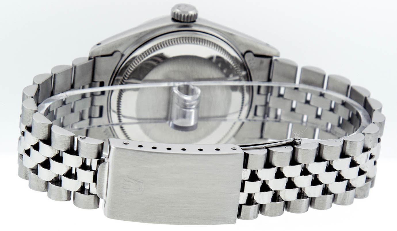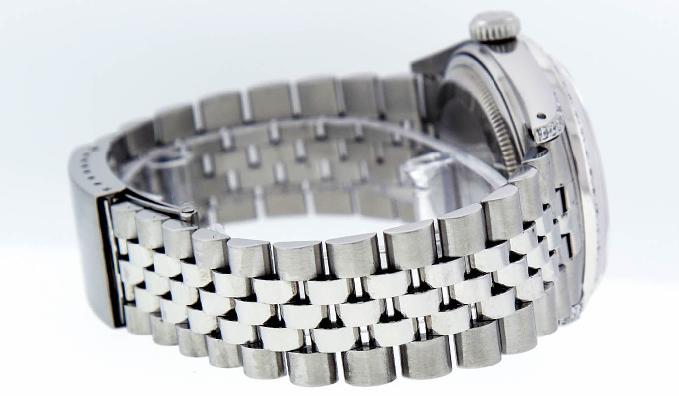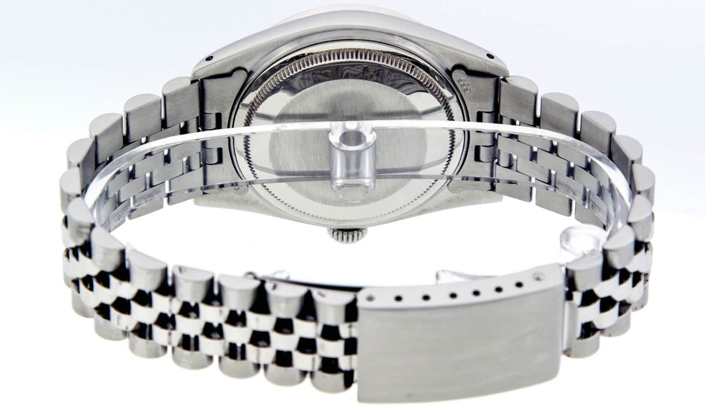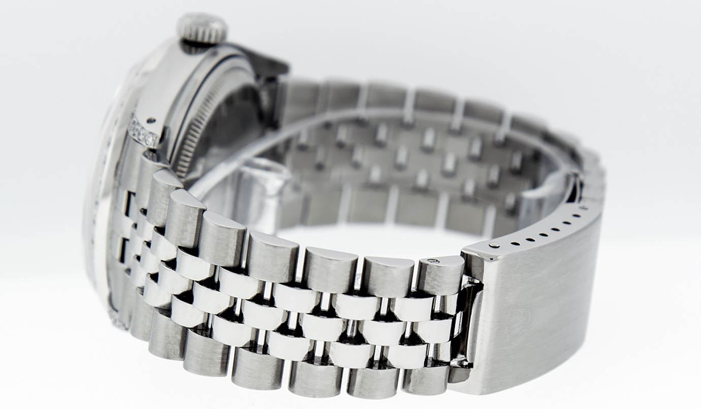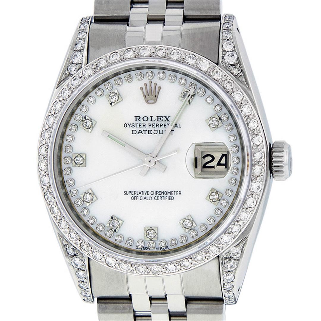 One Gents Rolex Datejust Polished, Serviced & Electronically Tested, Stainless Steel Case:36mm, Stainless Steel Crown, Custom Bezel: 18K White Gold Beadset Diamond Bezel, Diamond Count: 44 Diamonds. Total Weight 1.0 Carat, Clarity: SI-VS, Color: G to H. Custom Crystal: Synthetic Sapphire Cyclops Lens. Movement: Automatic Winding Movement Caliber 3035. Custom Dial: Mother Of Pearl String Diamond Dial VVS, Diamond Count: 58 Diamond In Dial G To H In Color, Clarity: VVS. Date Window: 3 O'Clock Position Date Display, Quickset, Model: Datejust Condition: G-6 Extra Fine. Bracelet: Stainless Steel Jubilee. Bright Polish & Satin Finish. 7.0 Inch Length, Adjustable. Standard Clasp, With Rolex Logo.
