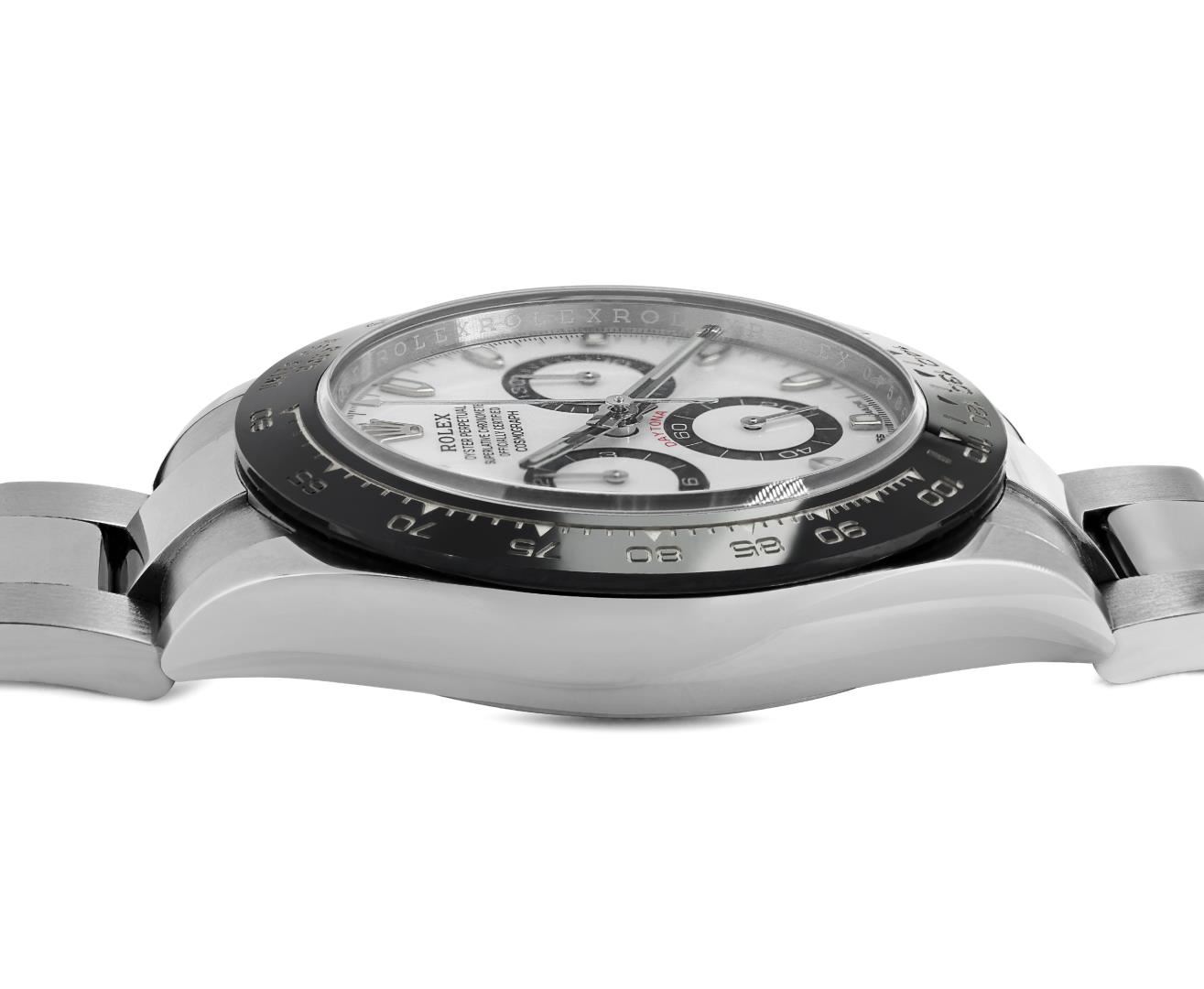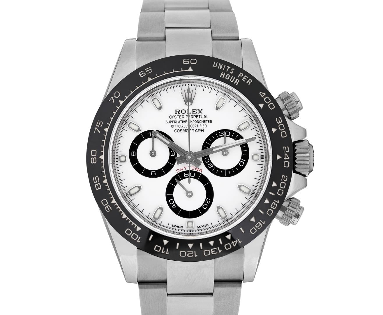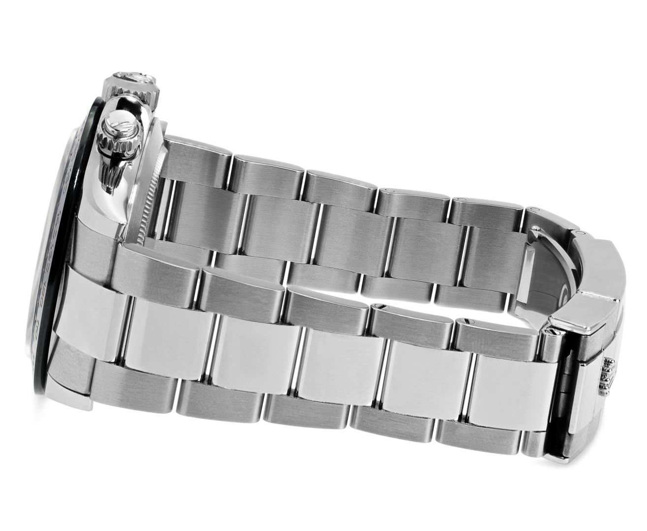 One Mens Pre Owned Stainless Steel Rolex Daytona With Date Polished, Serviced And Electronically Tested, Rolex Stainless Steel Case: 40mm, Rolex Stainless Steel Crown, Rolex Bezel: Stainless Steel Rotatable Bezel With Black Ceramic Insert. Crystal: Sapphire With Magnified Date Window. Rolex Movement: Automatic Winding Movement Caliber 4130. This watch features A Chronograph with Large Central Chronograph Second Hand, 30 Minute Counter Sub-Dial at 3 O'Clock, 12 Hour Counter Sub-Dial at 9 O'Clock. Small Second Sub-Dial at 6 O'Clock. Rolex Dial: White with White Luminous hands and Index hour markers with small seconds hand at 6 o'clock, 30-minute counter at 3 o'clock and 12-hour counter at 9 o'clock. Date Display, Model: Daytona 116500. Condition: G-6 Extra Fine. Rolex Bracelet: Stainless Steel Oyster Band. Bright Polish & Satin Finish. 7.0 Inch Length, Adjustable. Standard Clasp, With Rolex Logo. This Watch Comes With A Rolex Box And Card.