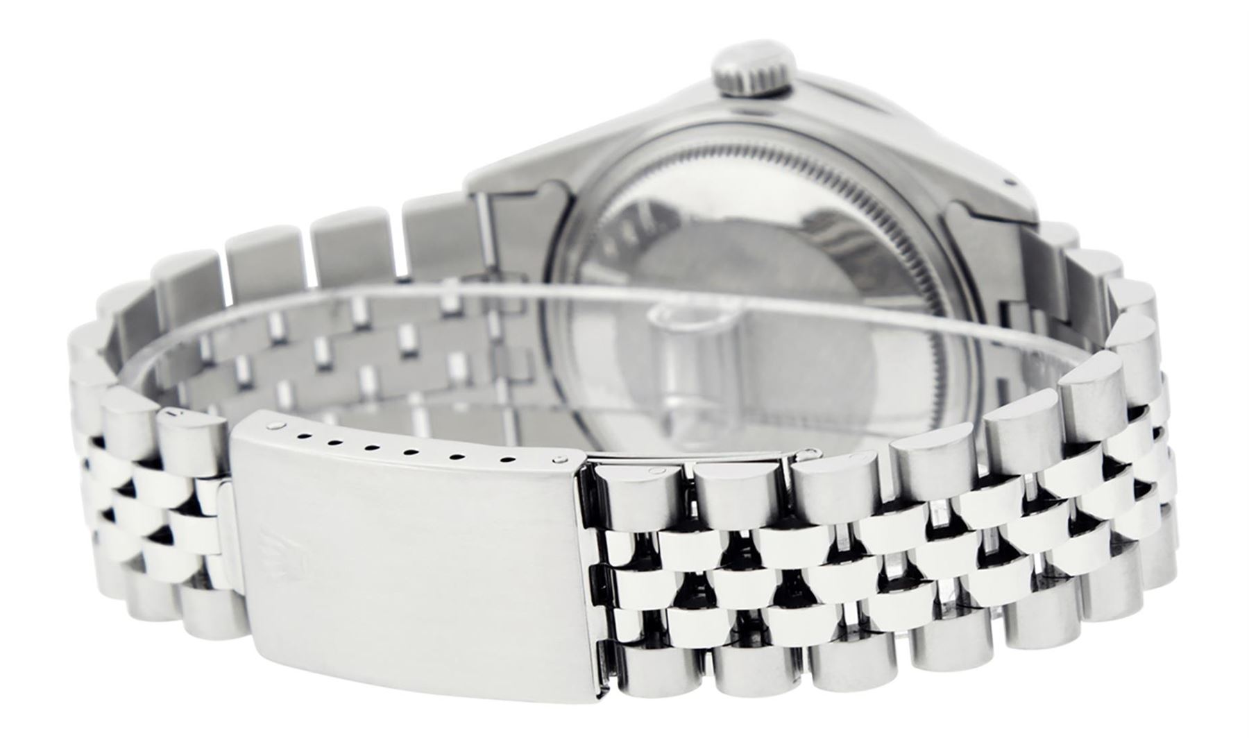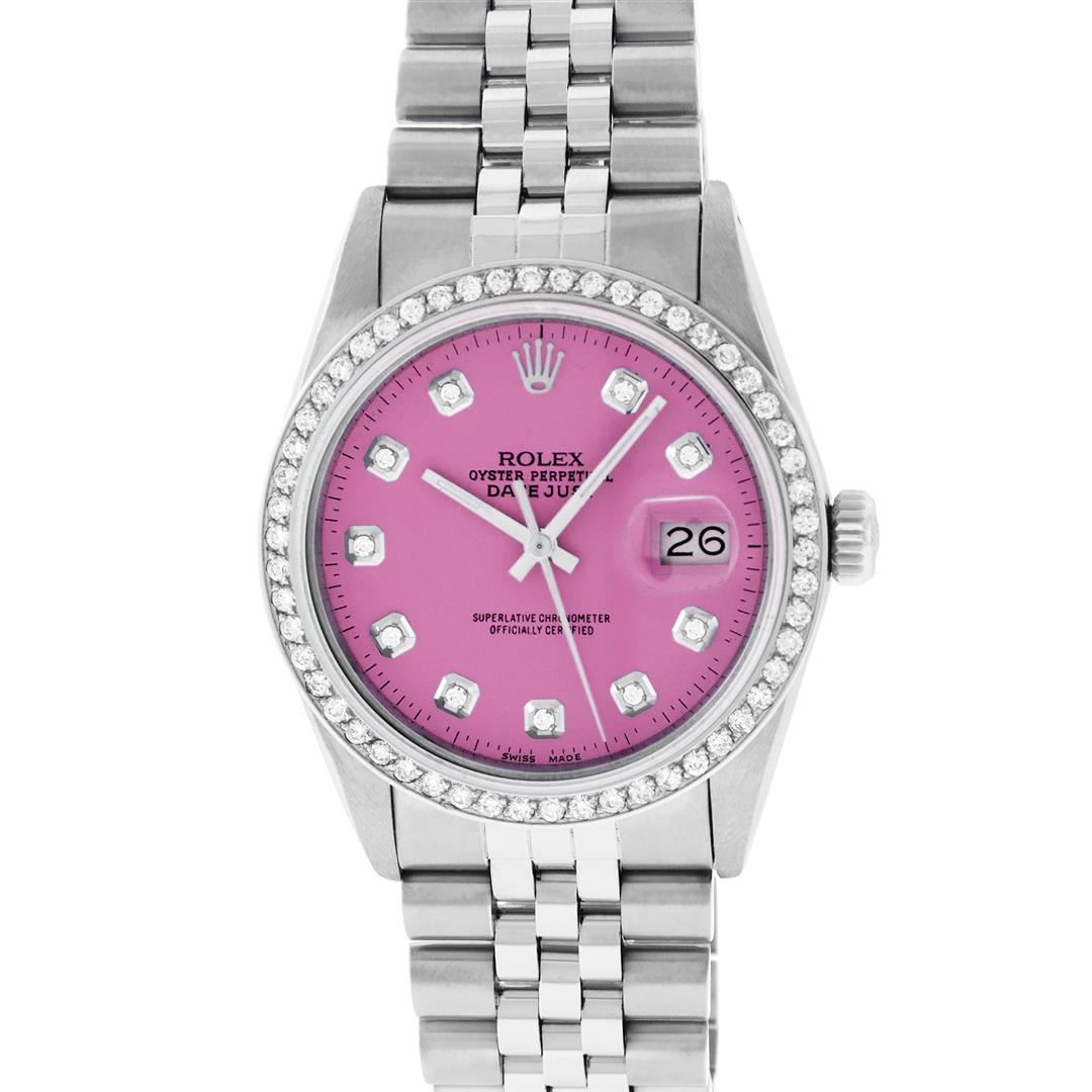 One Mens Pre Owned Rolex Stainless Steel Datejust Polished Bright with Satin Finish, This Watch Has Been Serviced & Electronically Tested, Rolex Stainless Steel Case: 36mm, Rolex Stainless Steel Crown, Custom Bezel: New Stainless Steel Bead set Diamond Be