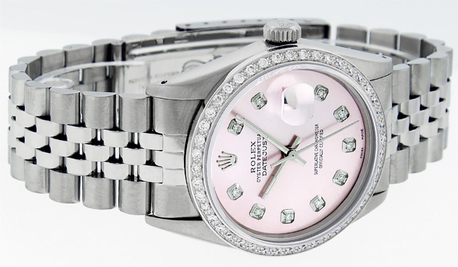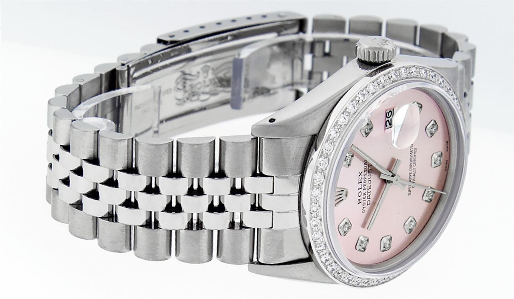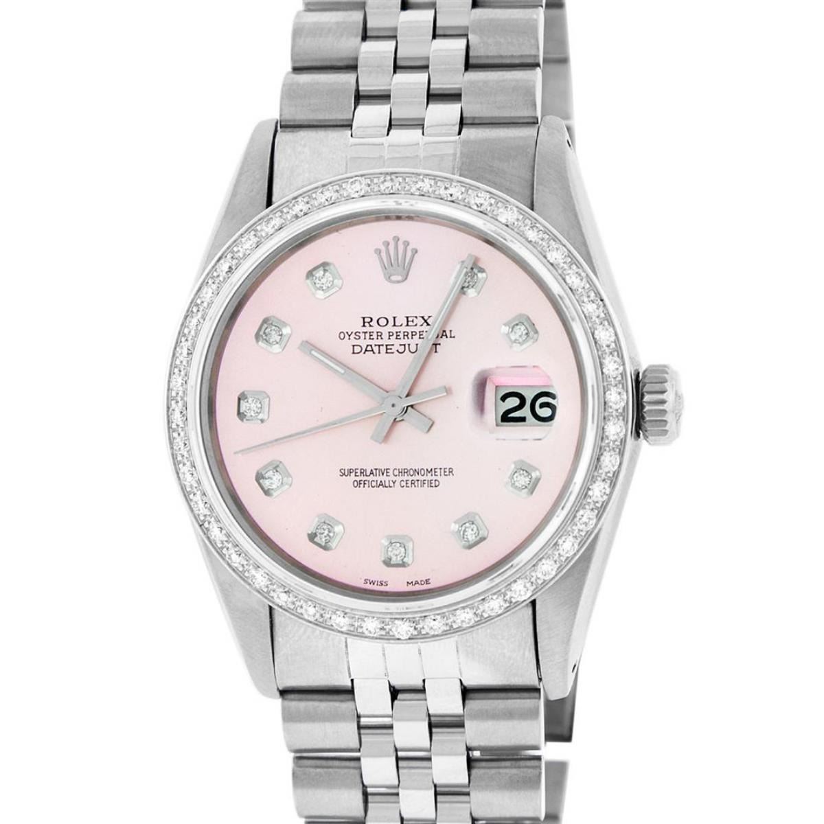 One Mens Pre Owned Stainless Steel Rolex Datejust Polished, Serviced & Electronically Tested, Rolex Stainless Steel Case: 36mm, Rolex Stainless Steel Crown, Custom Bezel: New 18K White Gold Beadset Diamond Bezel, Diamond Count: 44 Diamonds, Clarity: SI-VS, Color: G to H. Custom Crystal: New Sapphire With Magnified Date, Custom Hands: New Luminescent Hands. Rolex Movement: Automatic Winding Movement. Custom Dial: Refinished To Pink With Custom Diamond Hour Markers, 10 Diamonds In Dial, G To H In Color, Clarity: SI-VS. Date Window: 3 O'Clock Position Date Display, Quickset, Model: Datejust. Condition: G-6 Extra Fine. Rolex Bracelet: Stainless Steel Jubilee Band. Bright Polish & Satin Finish. 7.0 Inch Length, Adjustable. Standard Clasp, With Rolex Logo. This Watch Has Been Serviced Time Tested And Is In Excellent Condition It Is Free Of All Scratches And Dents.