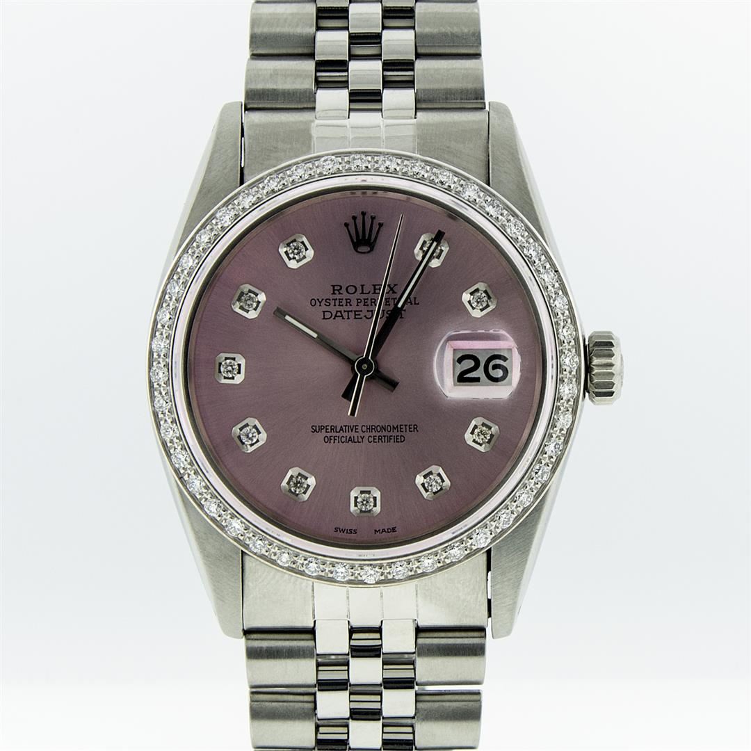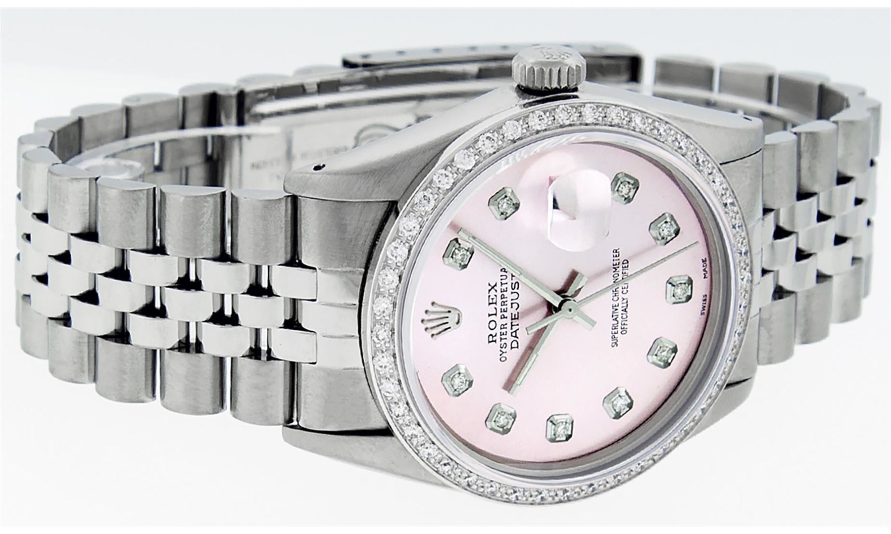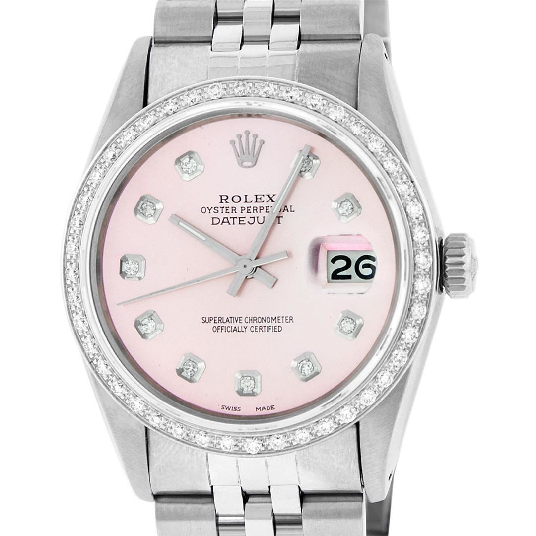 One Mens Pre Owned Stainless Steel Rolex Datejust Polished, Serviced & Electronically Tested, Rolex Stainless Steel Case: 36mm, Rolex Stainless Steel Crown, Custom Bezel: New 18K White Gold Beadset Diamond Bezel, Diamond Count: 44 Diamonds, Clarity: SI-VS, Color: G to H. Custom Crystal: New Sapphire With Magnified Date, Custom Hands: New Luminescent Hands. Rolex Movement: Automatic Winding Movement. Custom Dial: Refinished To Pink With Custom Diamond Hour Markers, 10 Diamonds In Dial, G To H In Color, Clarity: SI-VS. Date Window: 3 O'Clock Position Date Display, Quickset, Model: Datejust. Condition: G-6 Extra Fine. Rolex Bracelet: Stainless Steel Jubilee Band. Bright Polish & Satin Finish. 7.0 Inch Length, Adjustable. Standard Clasp, With Rolex Logo. This Watch Has Been Serviced Time Tested And Is In Excellent Condition It Is Free Of All Scratches And Dents.