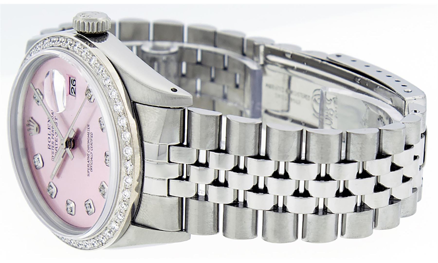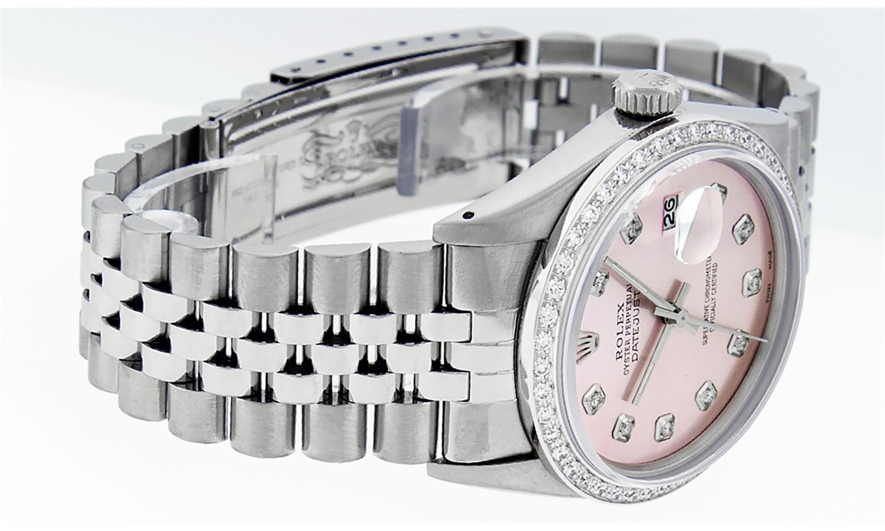 One Mens Stainless Steel Rolex Datejust Polished, Serviced & Electronically Tested, Stainless Steel Case: 36mm, Stainless Steel Crown, Custom Bezel: New 18K White Gold Beadset Diamond Bezel, Diamond Count: 44 Diamonds, Total Weight 1.00 Carat, Clarity: SI-VS, Color: G to H. Custom Crystal: New Scratch Resistant Synthetic Sapphire Cyclops Lens. Custom Hands: New Luminescent Hands. Movement: Automatic Winding Movement. Custom Dial: Ice Pink With Diamond Hour Markers, 10 Diamonds In Dial, G To H In Color, Clarity: SI-VS. Date Window: 3 O'Clock Position Date Display, Quickset, Model: Datejust. Condition: G-6 Extra Fine. Bracelet: Stainless Steel Jubilee Band. Bright Polish & Satin Finish. 7.0 Inch Length, Adjustable. Standard Clasp, With Rolex Logo. This Watch Has Been Serviced Time Tested And Is In Excellent Condition It Is Free Of All Scratches And Dents.