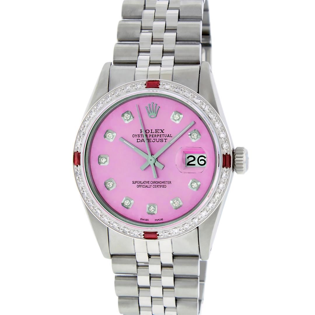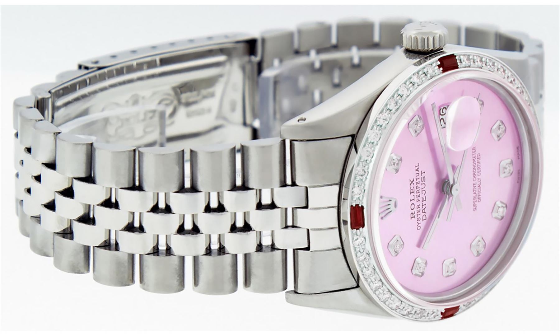 One Mens Pre Owned Stainless Steel Rolex Datejust Polished, Serviced & Electronically Tested, Stainless Steel Case: 36mm, Rolex Stainless Steel Crown, Custom Bezel: New 18K White Gold Ruby Beadset Diamond Bezel, Diamond + Gem Count: 36 Diamonds + 4 Rubies, Clarity: SI-VS, Color: G to H. Custom Crystal: New Sapphire With Magnified Date. Custom Hands: New Luminescent Hands. Rolex Movement: Automatic Winding Movement. Custom Refinished Dial: Refinished To Pink With Custom Added Diamond Hour Markers, Diamond Count: 10 Diamonds In Dial, G To H In Color, Clarity: SI-VS. Date Window: 3 O'Clock Position Date Display, Quickset, Model: Datejust. Condition: G-6 Extra Fine. Rolex Bracelet: Stainless Steel Jubilee Band. Bright Polish & Satin Finish. 7.0 Inch Length, Adjustable. Standard Clasp, With Rolex Logo. This Watch Has Been Serviced Time Tested And Is In Excellent Condition It Is Free Of All Scratches And Dents.