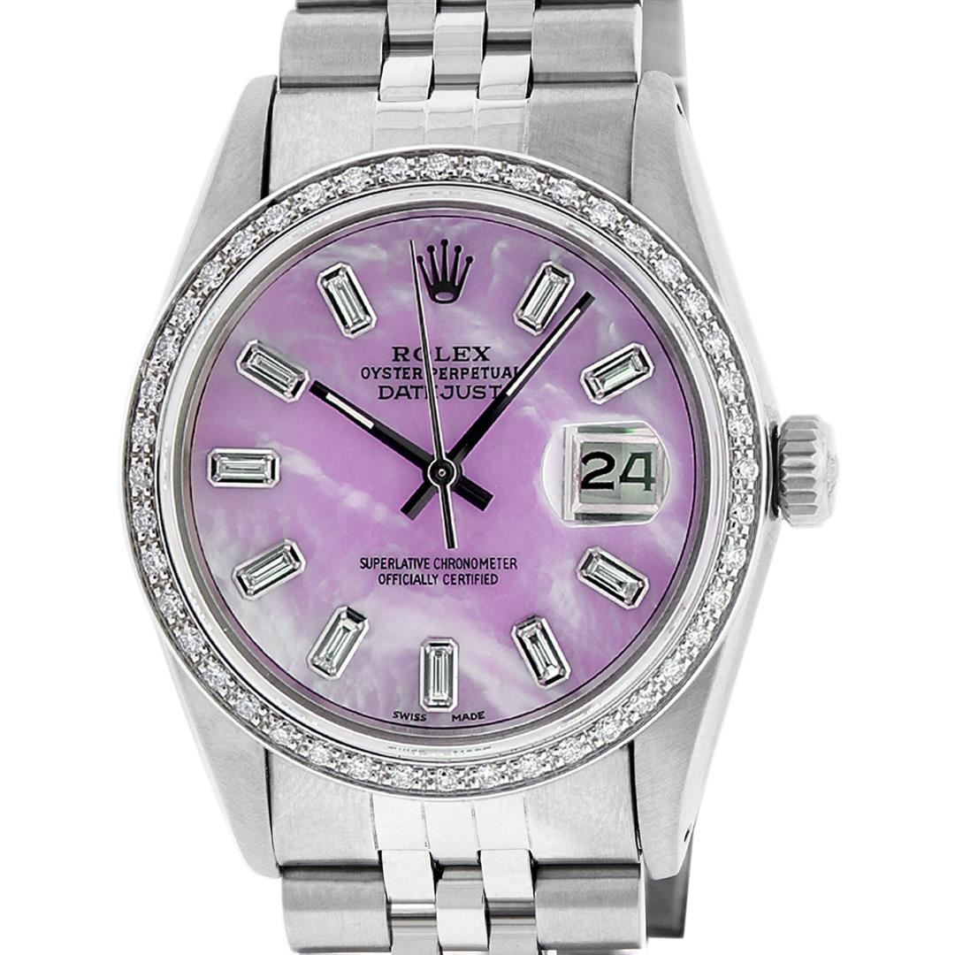 One Mens Pre Owned Stainless Steel Rolex Datejust Polished, Serviced & Electronically Tested, Rolex Stainless Steel Case: 36mm, Rolex Stainless Steel Crown, New Custom Bezel: 18K White Gold Beadset Diamond Bezel, Diamond Count: 44 Diamonds. Total Weight 1.00 Carat, Clarity: SI-VS, Color: G to H. Custom Crystal: New Sapphire With Magnified Date. Custom Hands: New Luminescent Hands. Rolex Movement: Automatic Winding Movement. Custom Dial: Pink Mother Of Pearl With Baguette Diamond Hour Markers, Stone Count: 10 Baguette Diamonds On Dial. G To H In Color, Clarity: SI-VS. Date Window: 3 O'Clock Position Date Display, Quickset, Model: Datejust. Condition: G-6 Extra Fine. Rolex Bracelet: Stainless Steel Jubilee Band. Bright Polish & Satin Finish. 7.0 Inch Length, Adjustable. Standard Clasp, With Rolex Logo. This Watch Has Been Serviced Time Tested And Is In Excellent Condition It Is Free Of All Scratches And Dents.