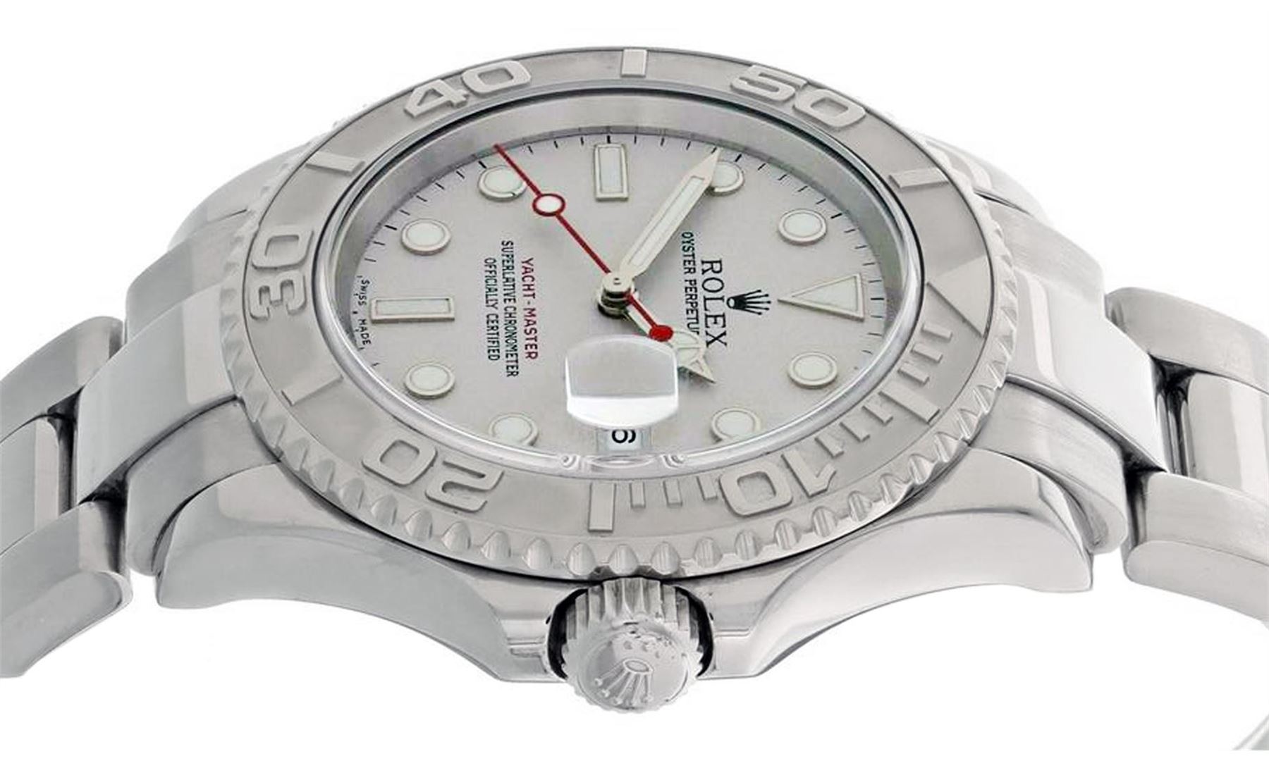 One Mens Pre Owned Rolex Stainless Steel Yacht Master Polished Bright with Satin Finish, This Watch Has Been Serviced & Electronically Tested, Rolex Stainless Steel Case: 40mm, Rolex Stainless Steel Crown with Rolex Logo, Rolex Bezel: Platinum Rotatable Time Lapse Bezel. Crystal: Sapphire With Magnified Date Window. Hands: Luminescent Hands With Red Second Hand. Rolex Movement: Automatic Winding Movement Caliber 3135. Dial: Platinum Dial With Luminous Hour Markers. Date Window: 3 O'Clock Position Date Display, Model: Yacht Master 16622. Condition: G-6 Extra Fine. Rolex Bracelet: Stainless Steel Oyster Band. Bright Polish & Satin Finish. 7.0 Inch Length, Adjustable. Flip Lock Clasp with Rolex Logo. This Watch Has Been Serviced Time Tested And Is In Excellent Condition It Is Free Of All Scratches And Dents.