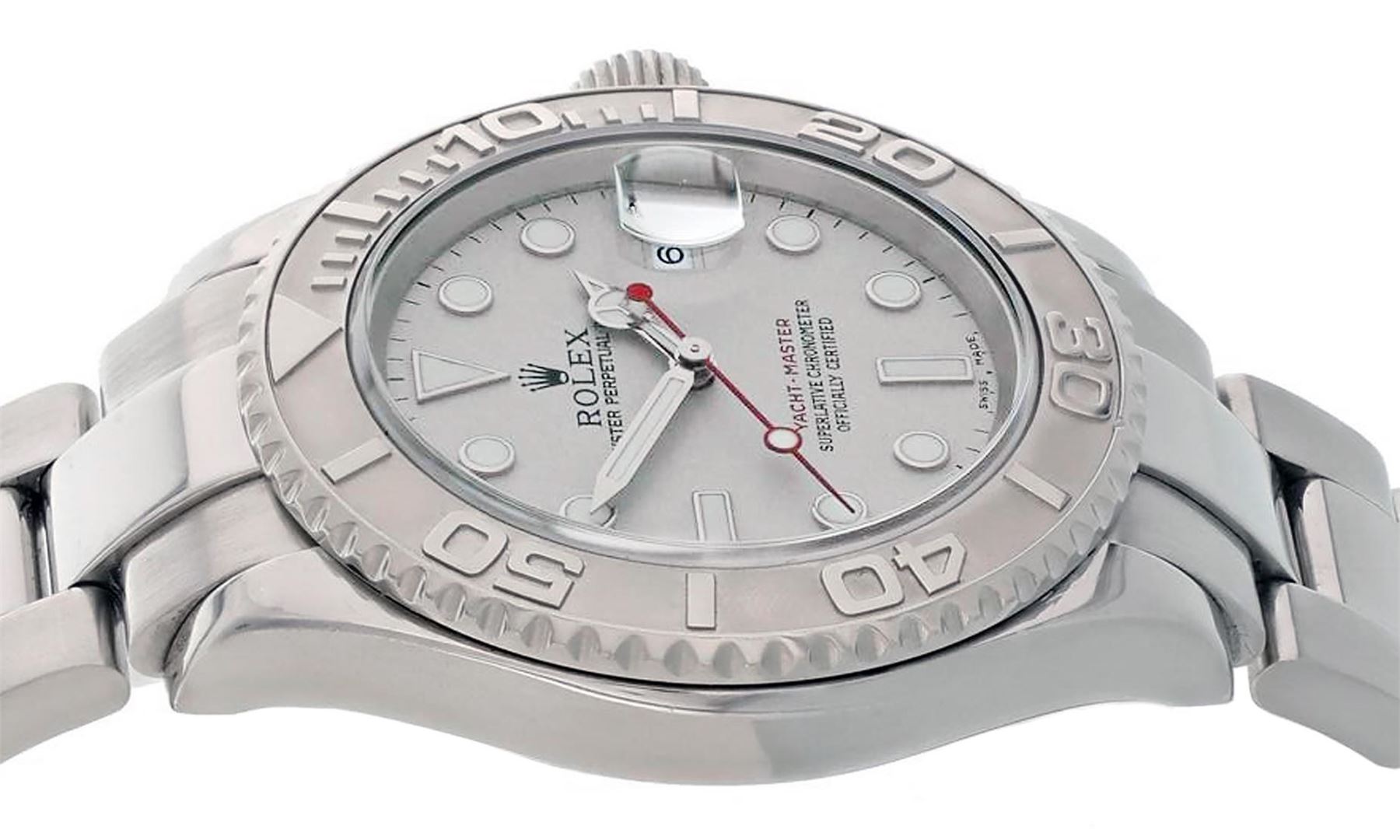One Mens Pre Owned Rolex Stainless Steel Yacht Master Polished Bright with Satin Finish, This Watch Has Been Serviced & Electronically Tested, Rolex Stainless Steel Case: 40mm, Rolex Stainless Steel Crown with Rolex Logo, Rolex Bezel: Platinum Rotatable Time Lapse Bezel. Crystal: Sapphire With Magnified Date Window. Hands: Luminescent Hands With Red Second Hand. Rolex Movement: Automatic Winding Movement Caliber 3135. Dial: Platinum Dial With Luminous Hour Markers. Date Window: 3 O'Clock Position Date Display, Model: Yacht Master 16622. Condition: G-6 Extra Fine. Rolex Bracelet: Stainless Steel Oyster Band. Bright Polish & Satin Finish. 7.0 Inch Length, Adjustable. Flip Lock Clasp with Rolex Logo. This Watch Has Been Serviced Time Tested And Is In Excellent Condition It Is Free Of All Scratches And Dents.