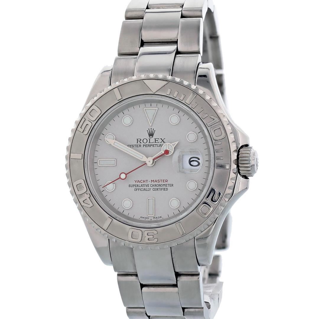 One Mens Pre Owned Rolex Stainless Steel Yacht Master Polished Bright with Satin Finish, This Watch Has Been Serviced & Electronically Tested, Rolex Stainless Steel Case: 40mm, Rolex Stainless Steel Crown with Rolex Logo, Rolex Bezel: Platinum Rotatable Time Lapse Bezel. Crystal: Sapphire With Magnified Date Window. Hands: Luminescent Hands With Red Second Hand. Rolex Movement: Automatic Winding Movement Caliber 3135. Dial: Platinum Dial With Luminous Hour Markers. Date Window: 3 O'Clock Position Date Display, Model: Yacht Master 16622. Condition: G-6 Extra Fine. Rolex Bracelet: Stainless Steel Oyster Band. Bright Polish & Satin Finish. 7.0 Inch Length, Adjustable. Flip Lock Clasp with Rolex Logo. This Watch Has Been Serviced Time Tested And Is In Excellent Condition It Is Free Of All Scratches And Dents.