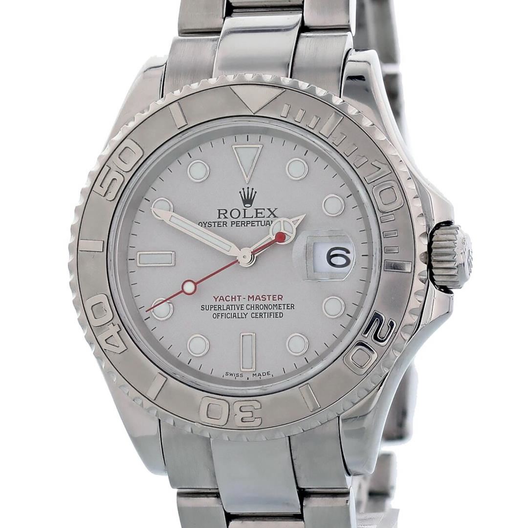 One Mens Pre Owned Rolex Stainless Steel Yacht Master Polished Bright with Satin Finish, This Watch Has Been Serviced & Electronically Tested, Rolex Stainless Steel Case: 40mm, Rolex Stainless Steel Crown with Rolex Logo, Rolex Bezel: Platinum Rotatable Time Lapse Bezel. Crystal: Sapphire With Magnified Date Window. Hands: Luminescent Hands With Red Second Hand. Rolex Movement: Automatic Winding Movement Caliber 3135. Dial: Platinum Dial With Luminous Hour Markers. Date Window: 3 O'Clock Position Date Display, Model: Yacht Master 16622. Condition: G-6 Extra Fine. Rolex Bracelet: Stainless Steel Oyster Band. Bright Polish & Satin Finish. 7.0 Inch Length, Adjustable. Flip Lock Clasp with Rolex Logo. This Watch Has Been Serviced Time Tested And Is In Excellent Condition It Is Free Of All Scratches And Dents.
