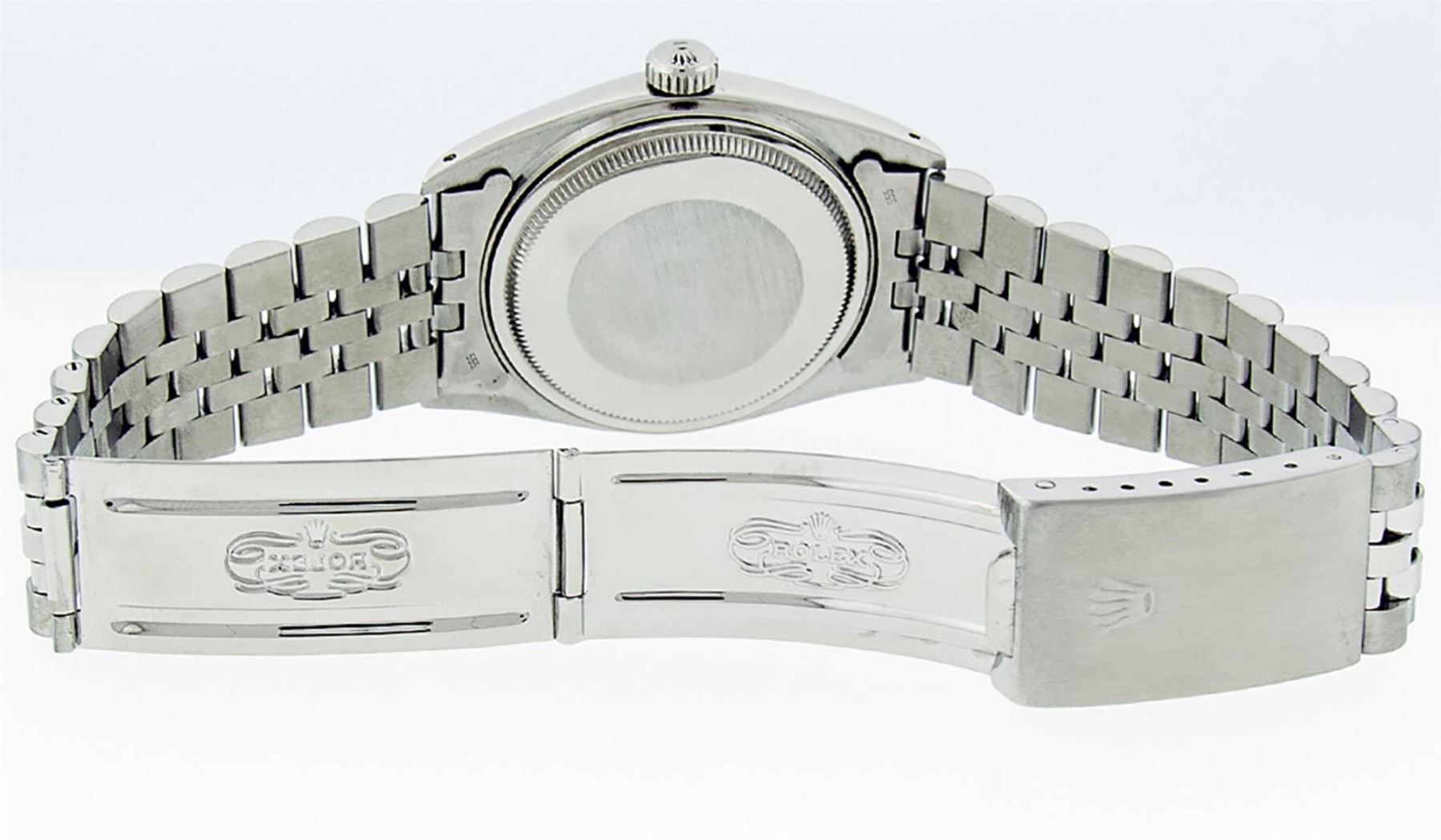 One Mens Stainless Steel Rolex Datejust Polished Bright with Satin Finish, This Watch Has Been Serviced & Electronically Tested, Stainless Steel Case: 36mm, Stainless Steel Crown, Bezel: 14K White Gold Fluted Bezel. Custom Crystal: New Acrylic Cyclops Lens. Custom Hands: New Luminescent Hands. Movement: Automatic Winding Movement. Custom Dial: Purple Diamond Dial With Diamond Hour Markers And Dash Track, Diamond Count: 10 Diamonds in Dial G To H In Color, SI-VS Clarity. Date Window: 3 O'Clock Position Date Display, Quickset, Model: Datejust, Condition: G-6 Extra Fine. Bracelet: Stainless Steel Jubilee Band. Bright Polish & Satin Finish. 7.0 Inch Length, Adjustable. Standard Clasp, With Rolex Logo. This Watch Has Been Serviced Time Tested And Is In Excellent Condition It Is Free Of All Scratches And Dents.
