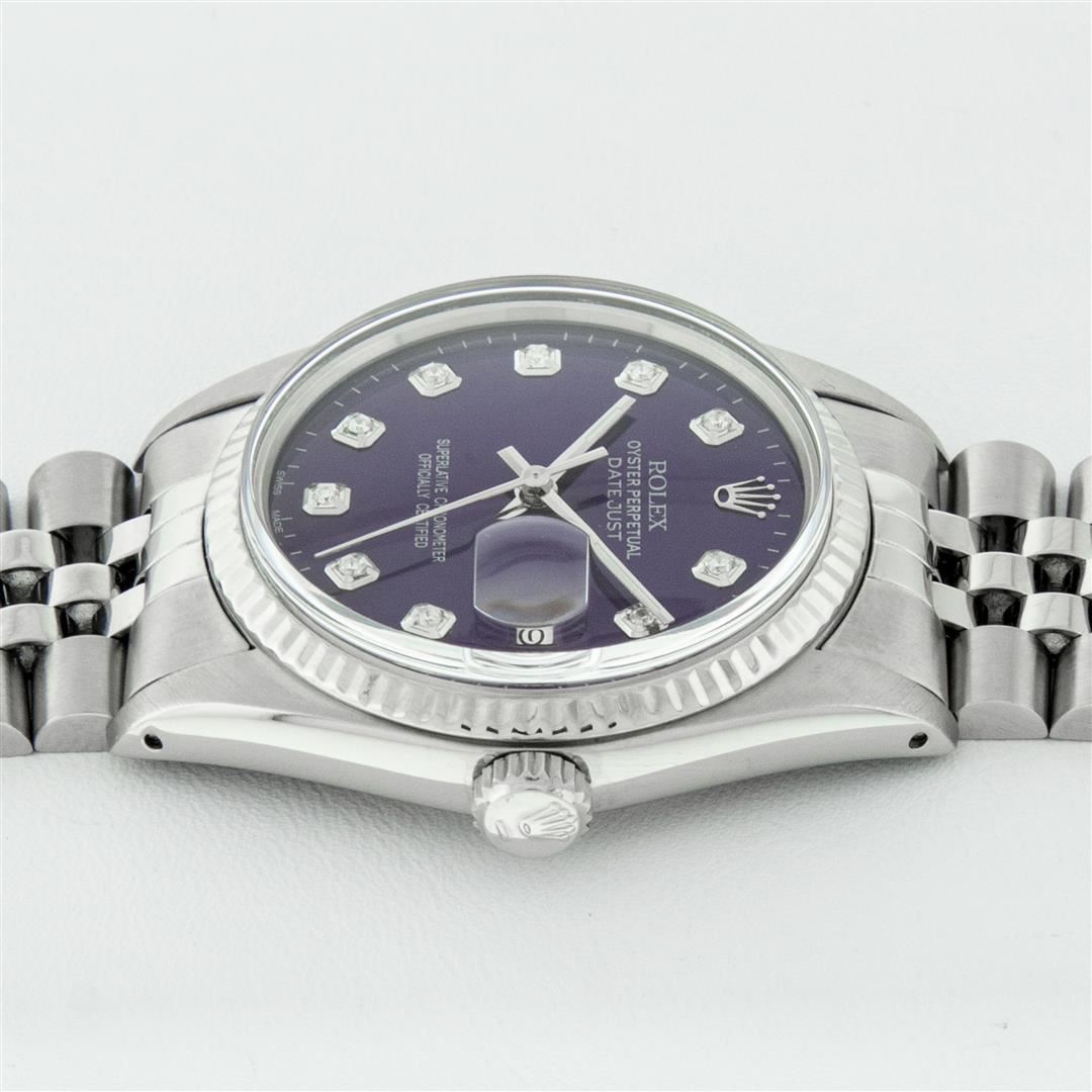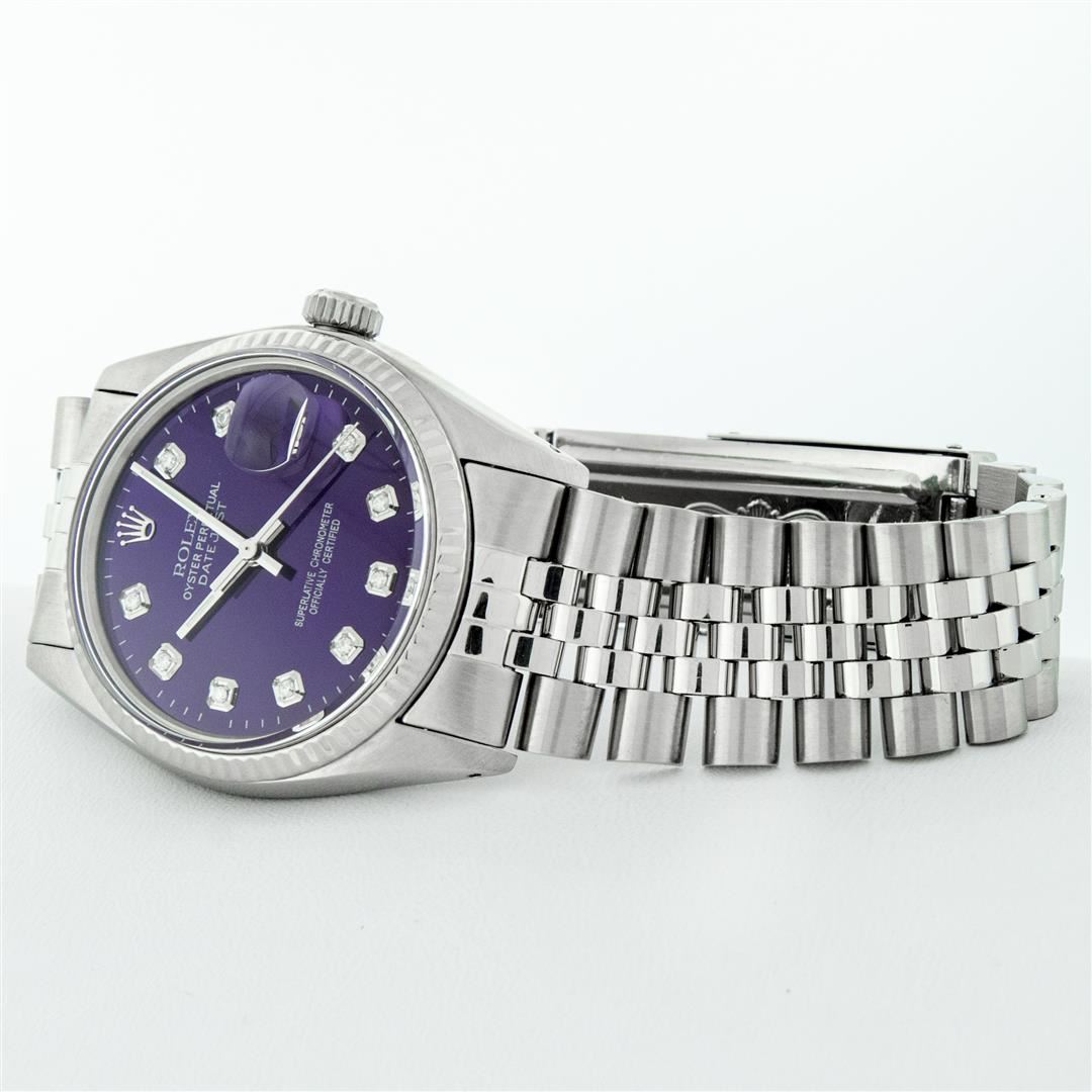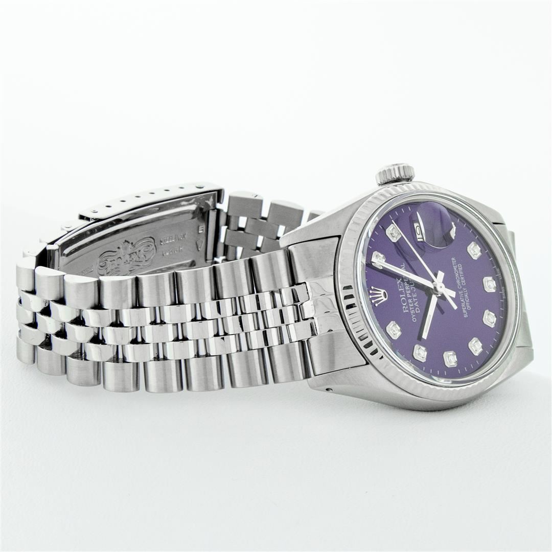 One Mens Pre Owned Stainless Steel Rolex Datejust Polished Bright with Satin Finish, This Watch Has Been Serviced & Electronically Tested, Stainless Steel Case: 36mm, Stainless Steel Crown, Rolex Bezel: 14K White Gold Fluted Bezel. Custom Crystal: New Acrylic Cyclops Lens. Custom Hands: New Luminescent Hands. Rolex Movement: Automatic Winding Movement. Custom Dial: Refinished Purple Diamond Dial With Added Diamond Hour Markers And Dash Track, Diamond Count: 10 Diamonds in Dial G To H In Color, SI-VS Clarity. Date Window: 3 O'Clock Position Date Display, Quickset, Model: Datejust, Condition: G-6 Extra Fine. Rolex Bracelet: Stainless Steel Jubilee Band. Bright Polish & Satin Finish. 7.0 Inch Length, Adjustable. Standard Clasp, With Rolex Logo. This Watch Has Been Serviced Time Tested And Is In Excellent Condition It Is Free Of All Scratches And Dents.