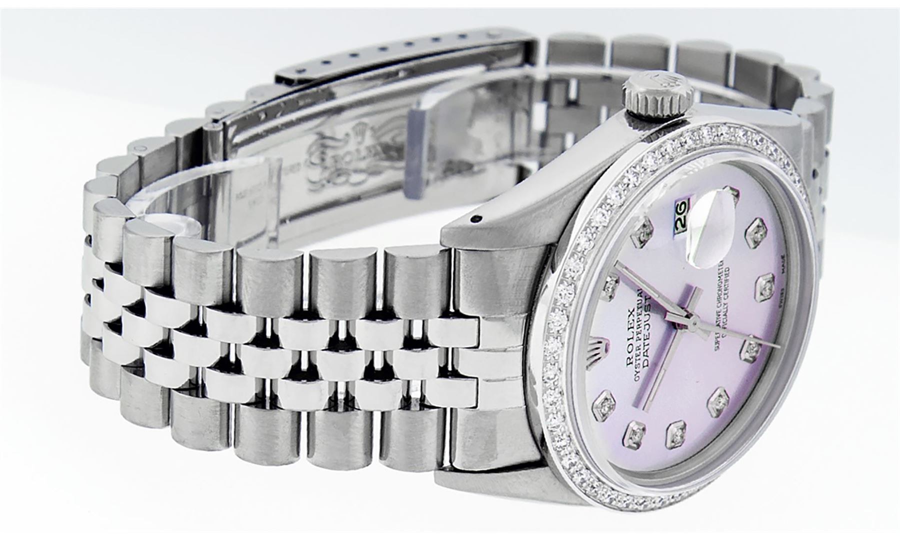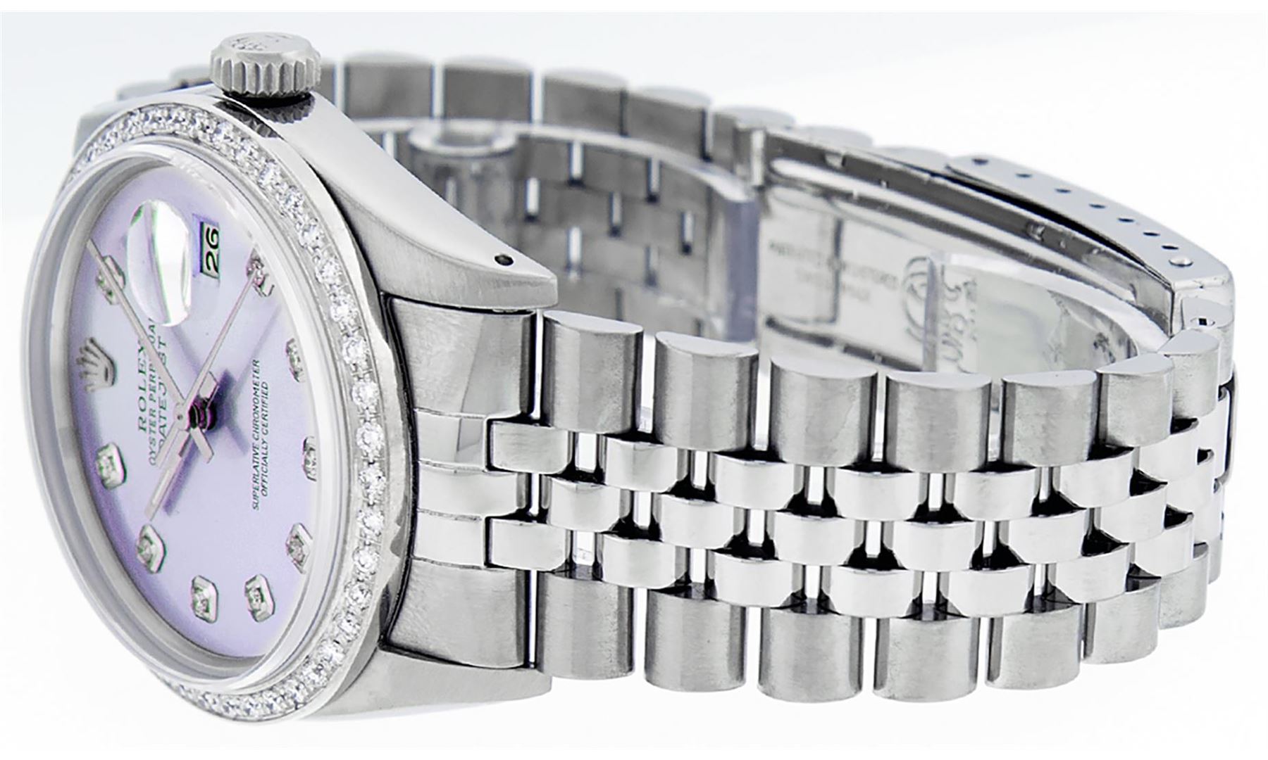 One Mens Pre Owned Stainless Steel Rolex Datejust Polished, Serviced & Electronically Tested, Rolex Stainless Steel Case: 36mm, Rolex Stainless Steel Crown, Custom Bezel: New 18K White Gold Bead set Diamond Bezel, Diamond Count: 44 Diamonds In Bezel, Clar