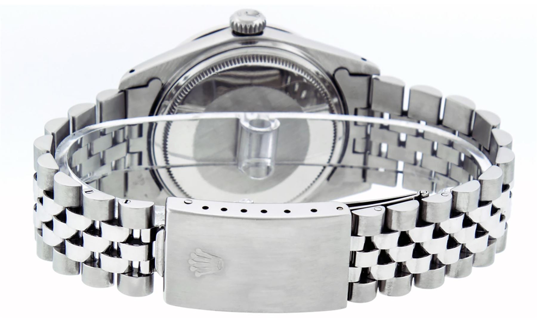 One Mens Pre Owned Stainless Steel Rolex Datejust Polished Bright with Satin Finish, This Watch Has Been Serviced & Electronically Tested, Rolex Stainless Steel Case: 36mm, Rolex Stainless Steel Crown, Custom Bezel: New 18K White Gold Sapphire Bead set Di