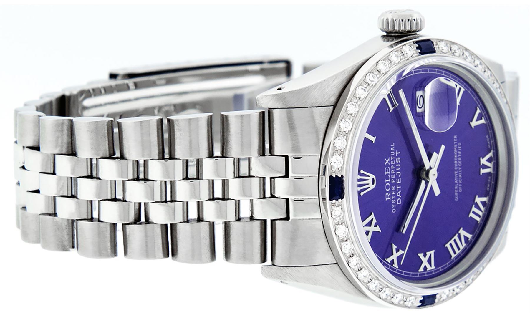 One Mens Pre Owned Stainless Steel Rolex Datejust Polished Bright with Satin Finish, This Watch Has Been Serviced & Electronically Tested, Rolex Stainless Steel Case: 36mm, Rolex Stainless Steel Crown, Custom Bezel: New 18K White Gold Sapphire Bead set Diamond Bezel, Diamond + Gem Count: 36 Diamonds + 4 Sapphires, Clarity: SI-VS, Color: G to H. Custom Crystal: New Sapphire With Date Window. Custom Hands: New Luminescent Hands. Rolex Movement: Automatic Winding Movement. Custom Dial: Refinished To Purple With Roman Hour Marker & Square Track. Date Window: 3 O'clock Position Date Display, Quickset, Model: Datejust, Condition: G-6 Extra Fine. Rolex Bracelet: Stainless Steel Jubilee Band. Bracelet: 7.0 Inch Length, Adjustable. Standard Clasp, With Rolex Logo. This Watch Has Been Serviced Time Tested And Is In Excellent Condition It Is Free Of All Scratches And Dents.
