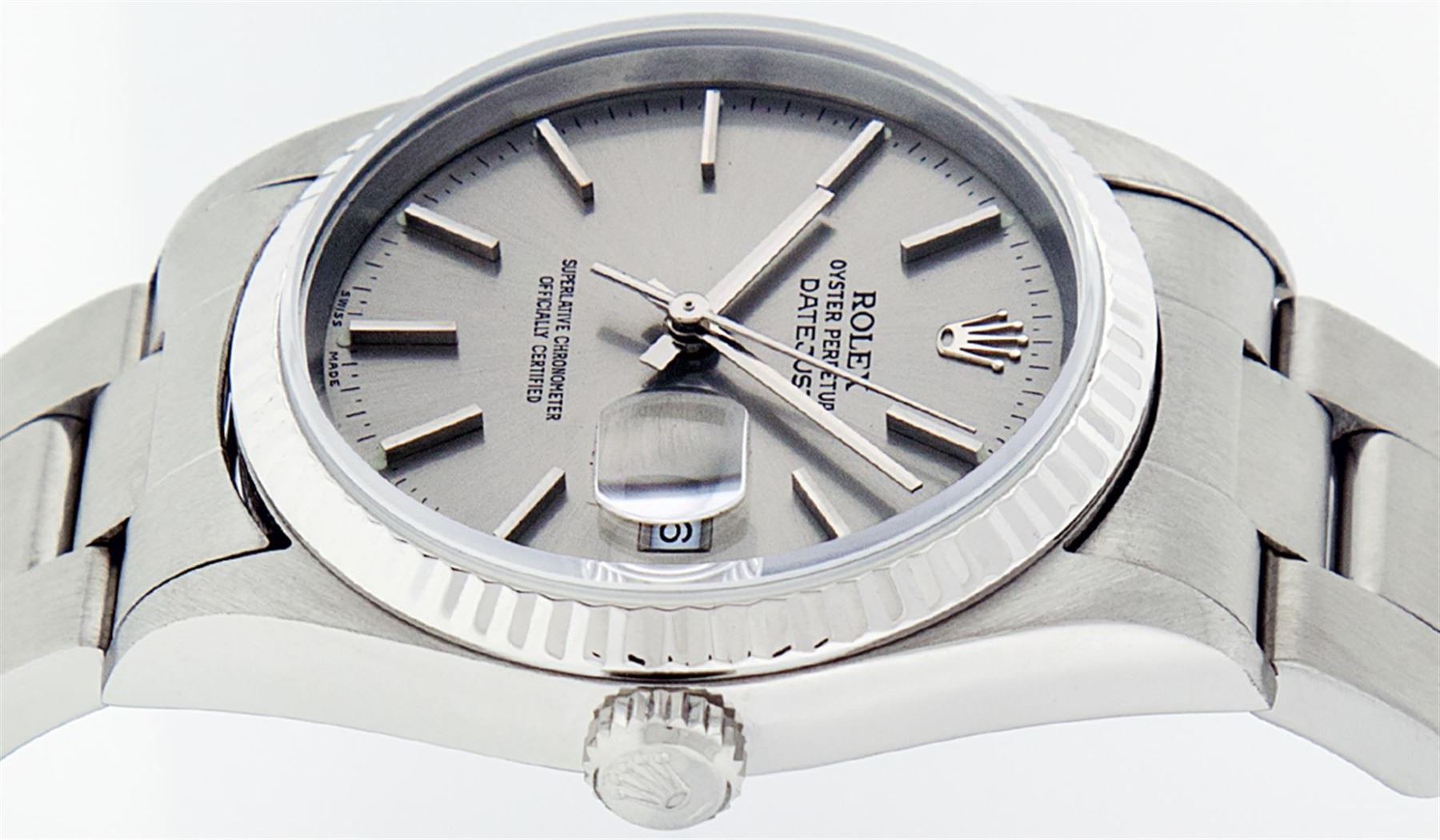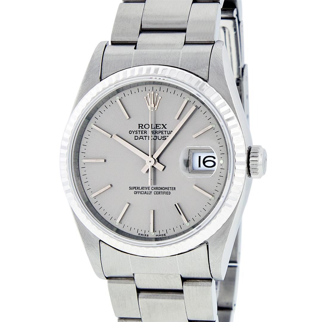 One Mens Rolex Quickset Stainless Steel Datejust Polished Bright with Satin Finish, Serviced & Electronically Tested, Rolex Stainless Steel Case: 36mm, Rolex Stainless Steel Crown, Rolex Bezel: 14K White Gold Fluted Bezel. Crystal: Sapphire With Magnified Date Window. Custom Hands: New Solid Hands. Rolex Movement: Automatic Winding Movement Caliber 3135. Custom Dial: Refinished To Gray With Index Hour Markers Dash Track And Lumi Dots. Date Window: 3 O'Clock Position Date Display, Quickset, Model: Quickset Datejust. Condition: G-6 Extra Fine. Rolex Bracelet: Stainless Steel Oyster Band. Bright Polish & Satin Finish. 7.0 Inch Length, Adjustable. Standard Clasp, With Rolex Logo. This Pre Owned Watch Has Been Serviced Time Tested And Is In Excellent Condition It Is Free Of All Scratches And Dents.