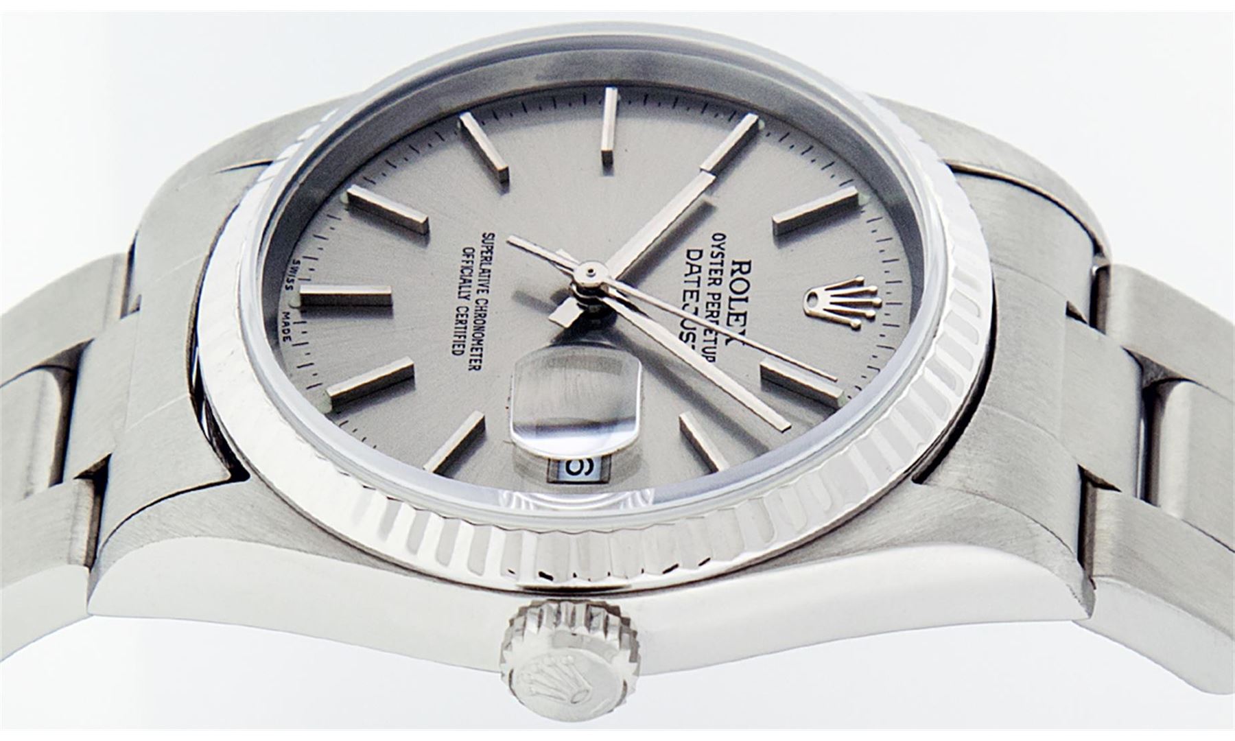 One Mens Rolex Quickset Stainless Steel Datejust Polished Bright with Satin Finish, Serviced & Electronically Tested, Rolex Stainless Steel Case: 36mm, Rolex Stainless Steel Crown, Rolex Bezel: 14K White Gold Fluted Bezel. Crystal: Sapphire With Magnified Date Window. Custom Hands: New Solid Hands. Rolex Movement: Automatic Winding Movement Caliber 3135. Custom Dial: Refinished To Gray With Index Hour Markers Dash Track And Lumi Dots. Date Window: 3 O'Clock Position Date Display, Quickset, Model: Quickset Datejust. Condition: G-6 Extra Fine. Rolex Bracelet: Stainless Steel Oyster Band. Bright Polish & Satin Finish. 7.0 Inch Length, Adjustable. Standard Clasp, With Rolex Logo. This Pre Owned Watch Has Been Serviced Time Tested And Is In Excellent Condition It Is Free Of All Scratches And Dents.