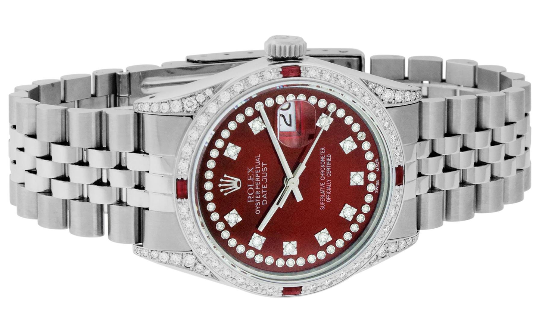One Mens Pre Owned Stainless Steel Rolex Datejust Polished Bright with Satin Finish, Serviced And Electronically Tested, Rolex Stainless Steel Case: 36mm, Custom Diamond Lugs: 28 Added Diamonds On Lugs. Rolex Stainless Steel Crown, Custom Bezel: New 18K White Gold Diamond + Ruby Beadset, Diamond Count: 36 Diamonds + 4 Rubies. Custom Crystal: New Sapphire With Date Window. Custom Hands: New Luminescent Hands. Rolex Movement: Automatic Winding Movement 3035. Custom Dial: Custom Red Dial With Custom Added Diamonds, Stone Count: 43 Diamonds On Dial. Date Window: 3 O'Clock Position Date Display, Quickset, Model: Datejust. Condition: G-6 Extra Fine. Rolex Bracelet: Stainless Steel Jubilee Band. Bright Polish And Satin Finish. 7.0 Inch Length, Adjustable. Standard Clasp, With Rolex Logo. This Watch Has Been Serviced And Polished And Its Free Of All Dents And Scratches.