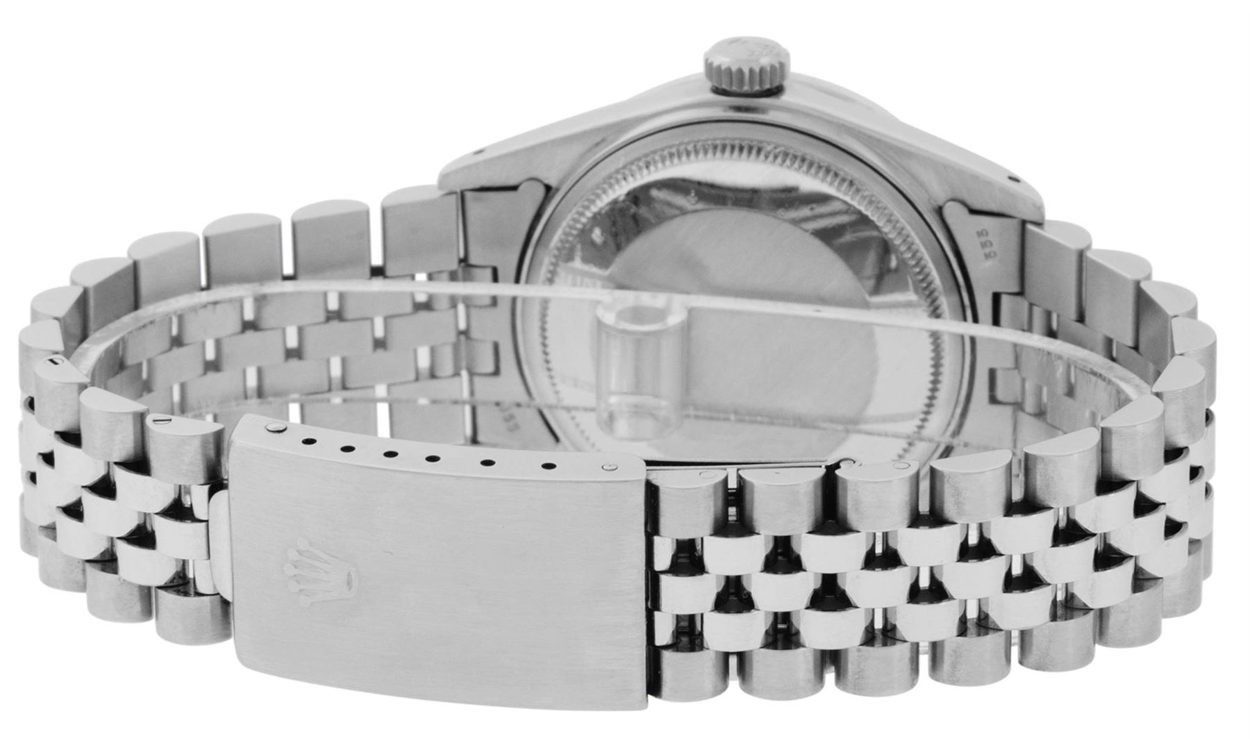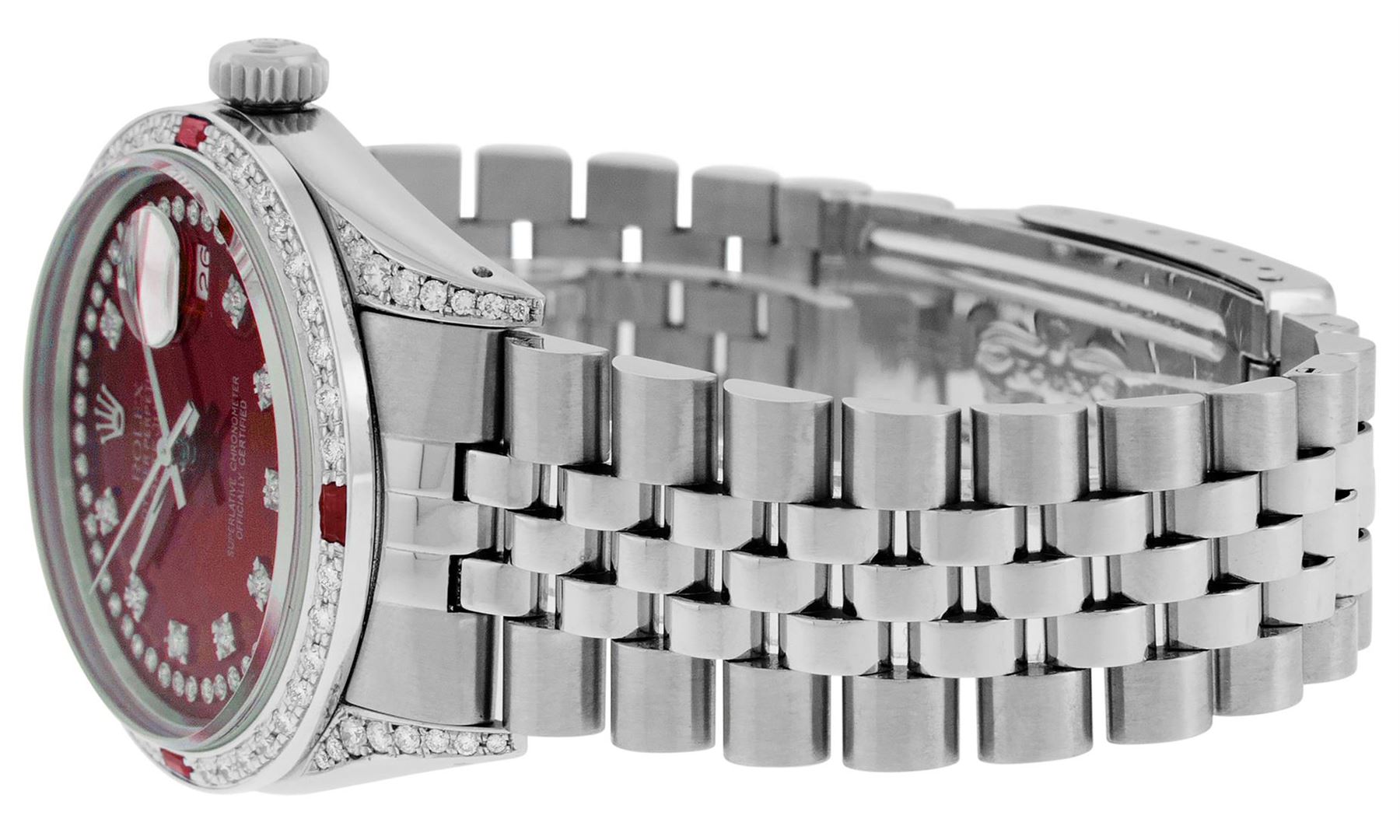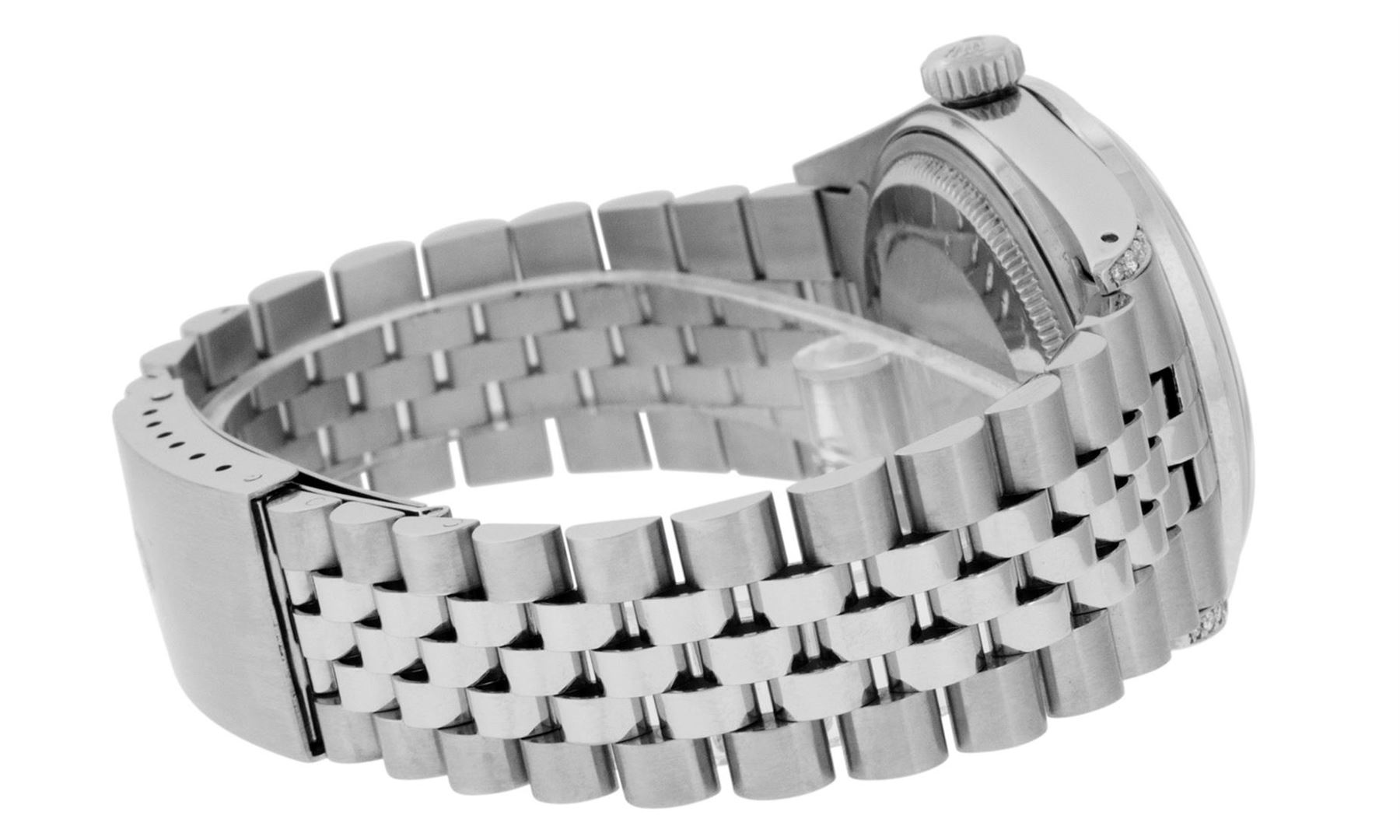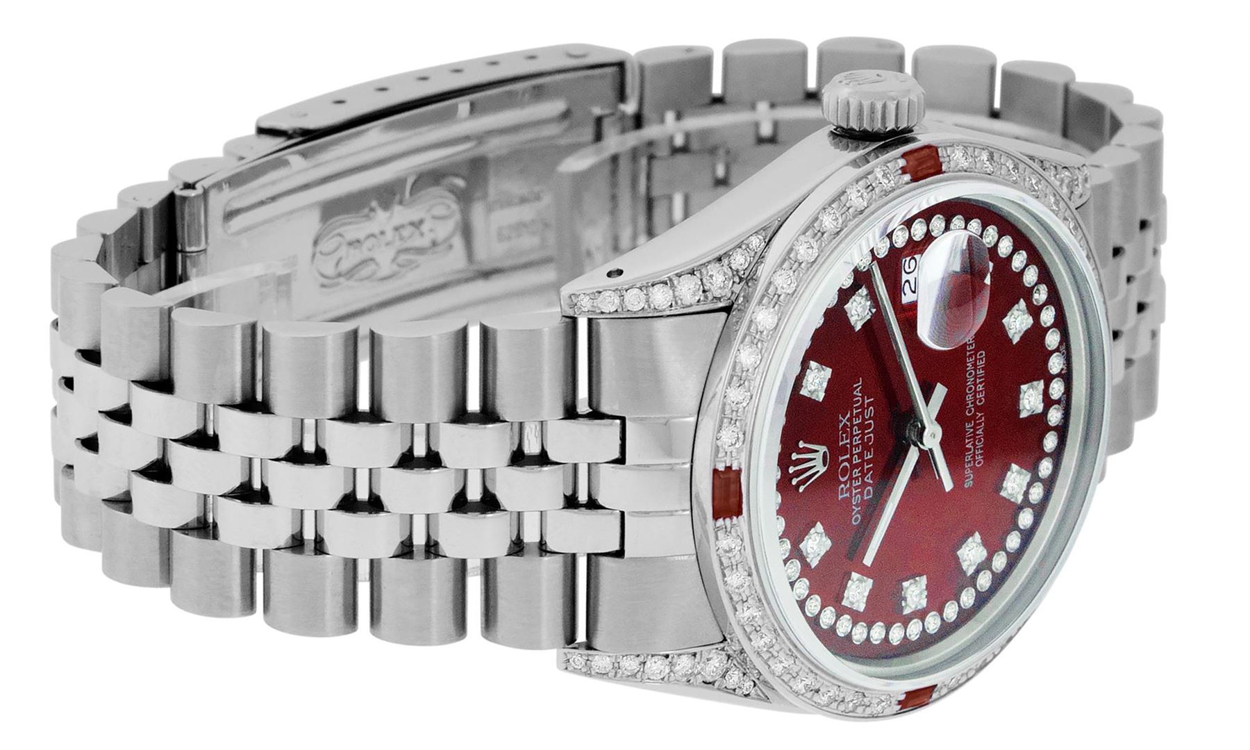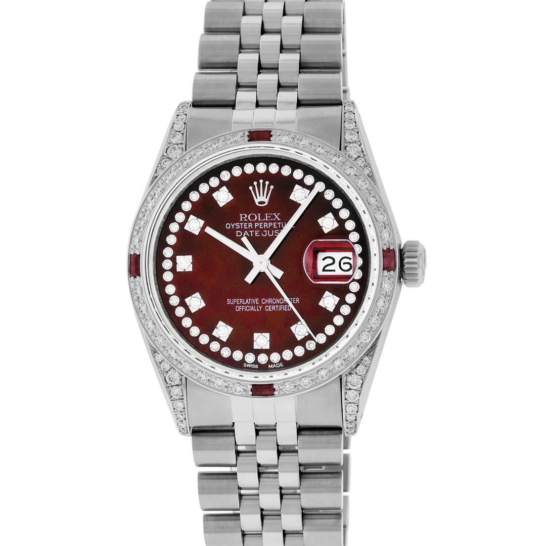 One Mens Pre Owned Rolex Datejust Polished Bright with Satin Finish, Serviced & Electronically Tested, Rolex Stainless Steel Case: 36mm, Custom Diamond Lugs: 28 Diamonds On Lugs, Color: G to H, Clarity: SI-VS. Rolex Stainless Steel Crown, Custom Bezel: Ne