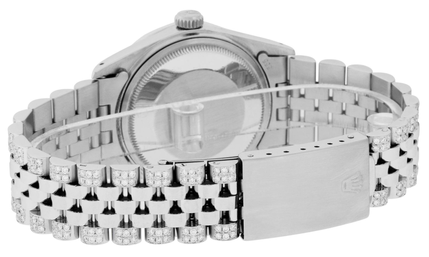 One Mens Pre Owned Rolex Datejust Polished Bright with Satin Finish, Serviced & Electronically Tested, Rolex Stainless Steel Case: 36mm, Custom Diamond Lugs: 28 Diamonds On Lugs, Color: G to H, Clarity: SI-VS. Stainless Steel Crown, Custom Bezel: New 18K White Gold Diamond + Ruby Beadset, Diamond Count: 36 Diamonds + 4 Rubies, Clarity: SI-VS, Color: G to H. Custom Crystal: New Sapphire With Date Window. Custom Hands: New Luminescent Hands. Rolex Movement: Automatic Winding Movement. Custom Dial: Refinished Red With Custom Added Diamonds, Stone Count: 43 Diamonds On Dial, Diamond Color: G To H In Color, Clarity: VS. Date Window: 3 O'Clock Position Date Display, Quickset, Model: Datejust Condition: G-6 Extra Fine. Rolex Bracelet: Stainless Steel Jubilee Band With Custom Added Diamonds. Bright Polish & Satin Finish. 7.0 Inch Length, Adjustable. Standard Clasp, With Rolex Logo. This Watch Has Been Serviced And Polished And Its Free Of All Dents And Scratches.