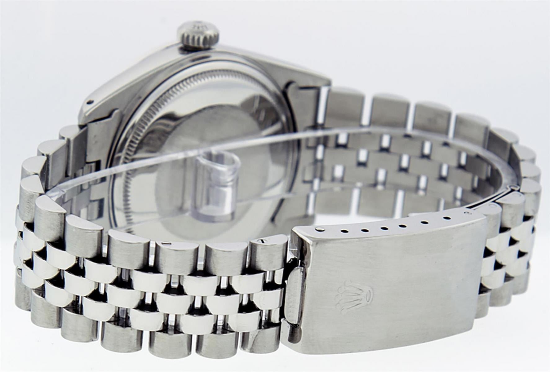 One Mens Stainless Steel Rolex Datejust Polished, Serviced & Electronically Tested, Stainless Steel Case: 36mm, Stainless Steel Crown, Custom Bezel: New 18K White Gold Ruby Beadset Diamond Bezel, Diamond + Gem Count: 36 Diamonds + 4 Rubies Total Weight 1.00 Carat, Clarity: SI-VS, Color: G to H. Custom Crystal: New Synthetic Sapphire Cyclops Lens. Custom Hands: New Luminescent Hands. Movement: Automatic Winding Movement. Custom Dial: Red Vignette With Diamond Hour Markers, 10 Diamond Dial G To H In Color, Clarity: SI-VS. Date Window: 3 O'Clock Position Date Display, Quickset, Model: Datejust. Condition: G-6 Extra Fine. Bracelet: Stainless Steel Jubilee. Bright Polish & Satin Finish. 7.0 Inch Length, Adjustable. Standard Clasp, With Rolex Logo. This Watch Has Been Serviced Time Tested And Is In Excellent Condition It Is Free Of All Scratches And Dents.