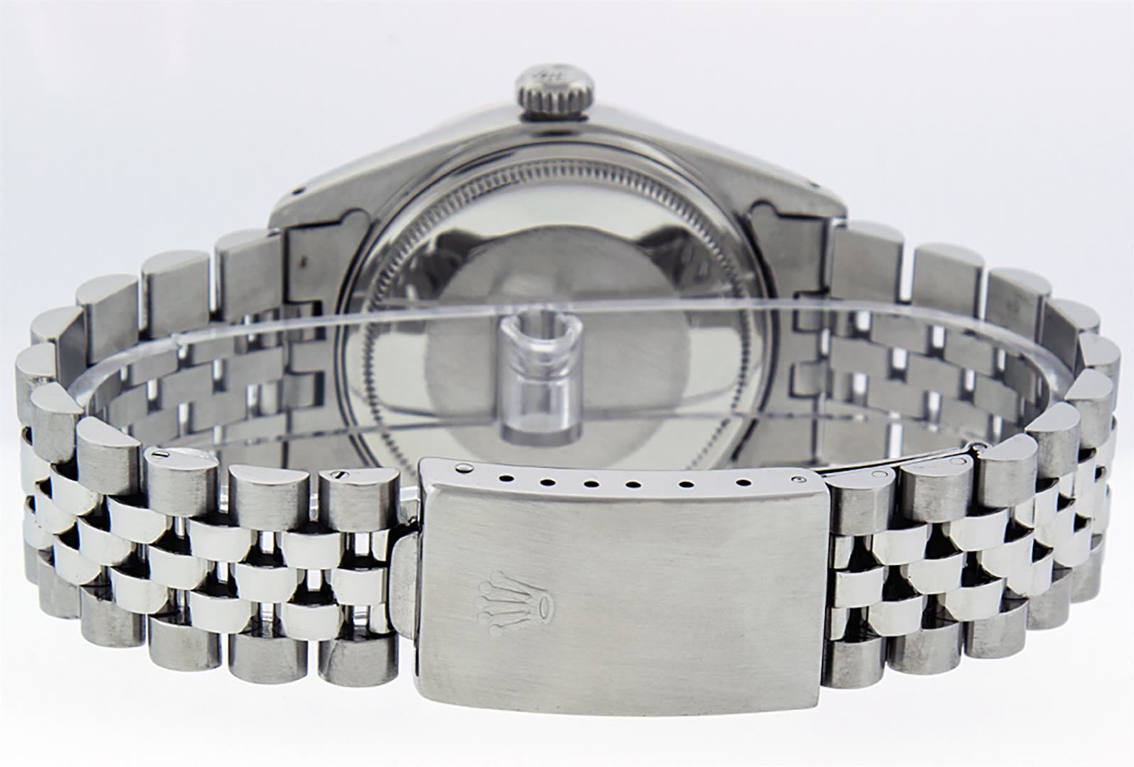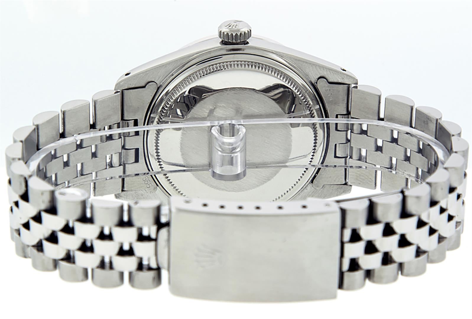 One Mens Stainless Steel Rolex Datejust Polished, Serviced & Electronically Tested, Stainless Steel Case: 36mm, Stainless Steel Crown, Custom Bezel: New 18K White Gold Ruby Beadset Diamond Bezel, Diamond + Gem Count: 36 Diamonds + 4 Rubies Total Weight 1.00 Carat, Clarity: SI-VS, Color: G to H. Custom Crystal: New Synthetic Sapphire Cyclops Lens. Custom Hands: New Luminescent Hands. Movement: Automatic Winding Movement. Custom Dial: Red Vignette With Diamond Hour Markers, 10 Diamond Dial G To H In Color, Clarity: SI-VS. Date Window: 3 O'Clock Position Date Display, Quickset, Model: Datejust. Condition: G-6 Extra Fine. Bracelet: Stainless Steel Jubilee. Bright Polish & Satin Finish. 7.0 Inch Length, Adjustable. Standard Clasp, With Rolex Logo. This Watch Has Been Serviced Time Tested And Is In Excellent Condition It Is Free Of All Scratches And Dents.