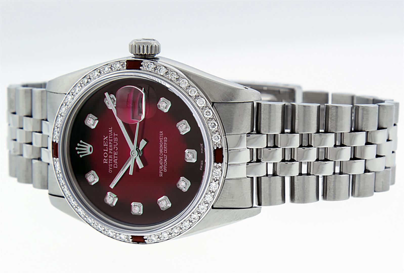 One Mens Stainless Steel Rolex Datejust Polished, Serviced & Electronically Tested, Stainless Steel Case: 36mm, Stainless Steel Crown, Custom Bezel: New 18K White Gold Ruby Beadset Diamond Bezel, Diamond + Gem Count: 36 Diamonds + 4 Rubies Total Weight 1.00 Carat, Clarity: SI-VS, Color: G to H. Custom Crystal: New Synthetic Sapphire Cyclops Lens. Custom Hands: New Luminescent Hands. Movement: Automatic Winding Movement. Custom Dial: Red Vignette With Diamond Hour Markers, 10 Diamond Dial G To H In Color, Clarity: SI-VS. Date Window: 3 O'Clock Position Date Display, Quickset, Model: Datejust. Condition: G-6 Extra Fine. Bracelet: Stainless Steel Jubilee. Bright Polish & Satin Finish. 7.0 Inch Length, Adjustable. Standard Clasp, With Rolex Logo. This Watch Has Been Serviced Time Tested And Is In Excellent Condition It Is Free Of All Scratches And Dents.