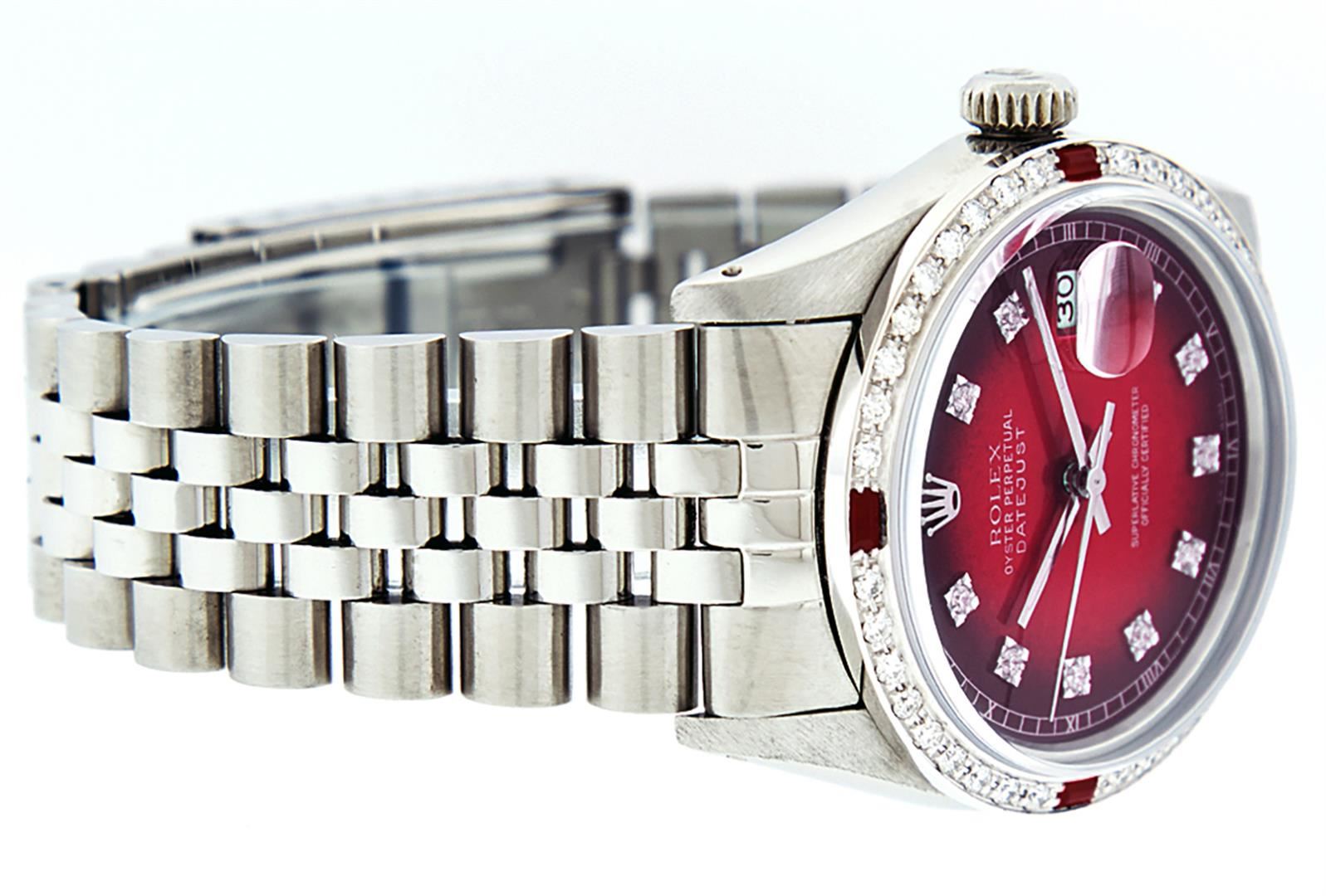 One Mens Stainless Steel Rolex Datejust Polished, Serviced & Electronically Tested, Stainless Steel Case: 36mm, Stainless Steel Crown, Custom Bezel: New 18K White Gold Ruby Beadset Diamond Bezel, Diamond + Gem Count: 36 Diamonds + 4 Rubies Total Weight 1.00 Carat, Clarity: SI-VS, Color: G to H. Custom Crystal: New Synthetic Sapphire Cyclops Lens. Custom Hands: New Luminescent Hands. Movement: Automatic Winding Movement. Custom Dial: Red Vignette With Diamond Hour Markers, 10 Diamonds in Dial, G To H In Color, Clarity: SI-VS. Date Window: 3 O'Clock Position Date Display, Quickset, Model: Datejust. Condition: G-6 Extra Fine. Bracelet: Stainless Steel Jubilee. Bright Polish & Satin Finish. 7.0 Inch Length, Adjustable. Standard Clasp, With Rolex Logo. This Watch Has Been Serviced Time Tested And Is In Excellent Condition It Is Free Of All Scratches And Dents