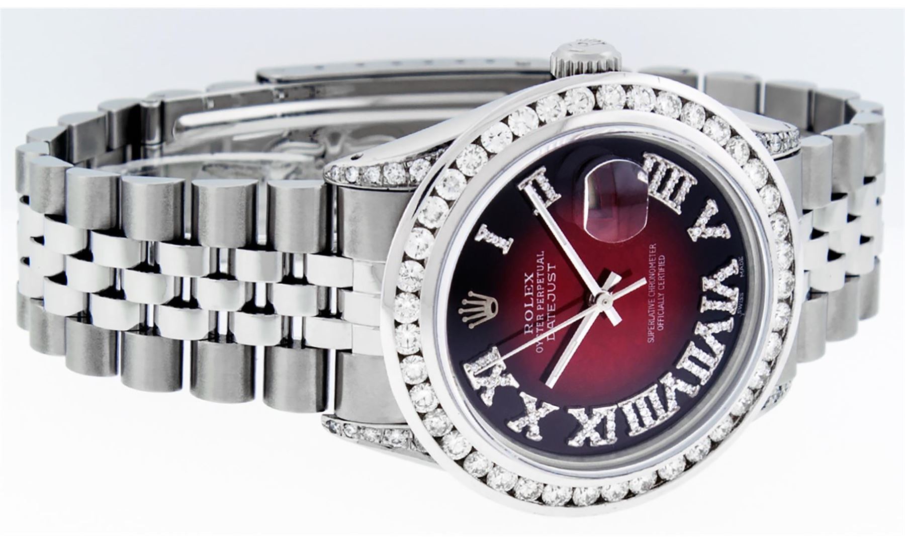 One Mens Stainless Steel Rolex Datejust Polished Bright with Satin Finish, Serviced & Electronically Tested, Stainless Steel Case: 36mm, Custom Diamond Lugs: 24 Diamonds On Lugs, Color: G to H, Clarity: SI-VS. Stainless Steel Crown, New Custom Bezel: 18K White Gold 3.00 Ctw Diamond Bezel, Diamond Count: 40 Diamonds, Total Weight 3.0 Carat, Clarity: SI-VS, Color: G to H. Custom Crystal: New Sapphire With Date Window. Rolex Movement: Automatic Winding Movement. Custom Dial: Refinished To Red Vignette With Custom Added Roman Diamond Hour Markers, Diamond Color: G To H In Color, Clarity: SI-VS. Date Window: 3 O'Clock Position Date Display, Quickset, Model: Quickset Datejust, Condition: G-6 Extra Fine. Rolex Bracelet: Stainless Steel Jubilee Band. Bright Polish & Satin Finish. 7.0 Inch Length, Adjustable. Standard Clasp, With Rolex Logo. This Watch Has Been Serviced Time Tested And Is In Excellent Condition It Is Free Of All Scratches And Dents.