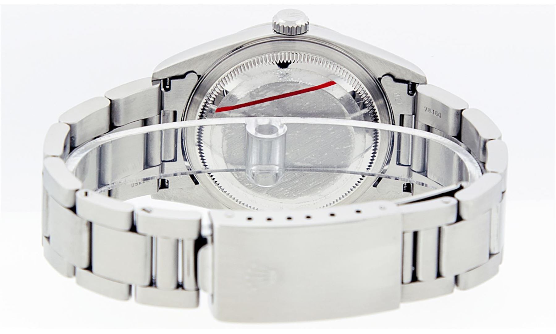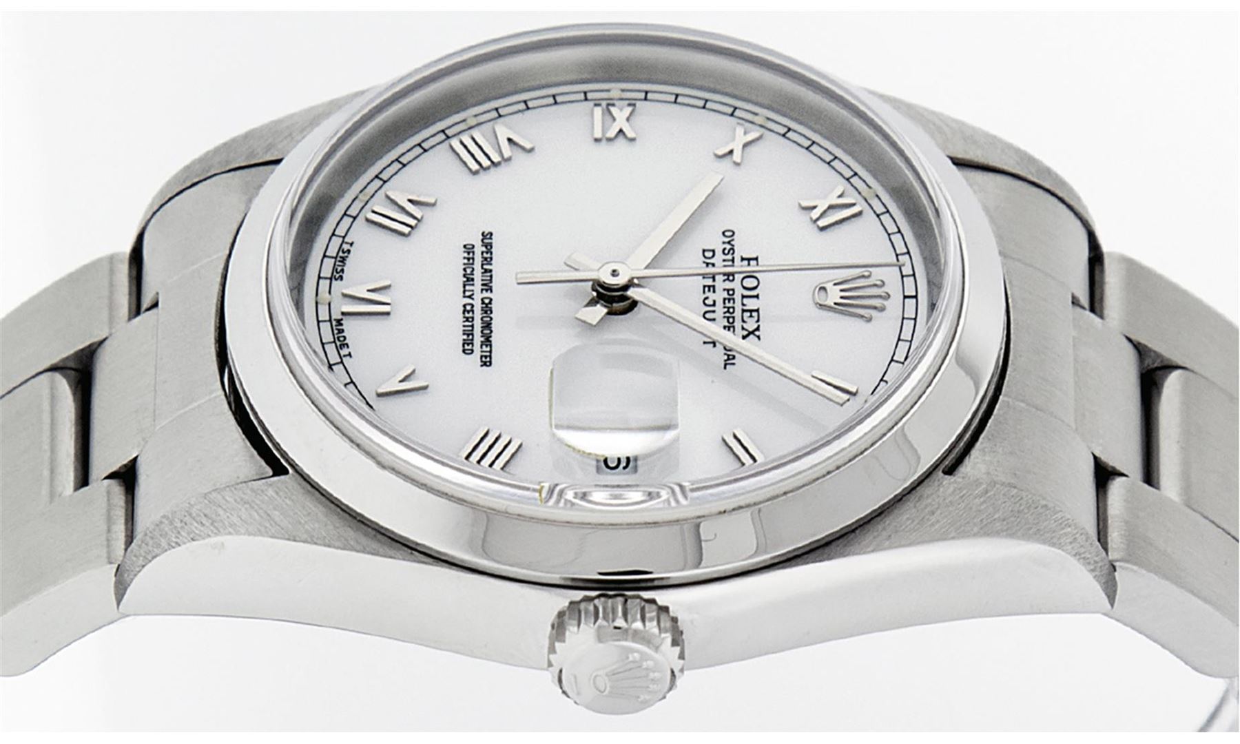 One Mens Rolex Pre Owned Quickset Stainless Steel Datejust Polished Bright with Satin Finish, Serviced & Electronically Tested, Rolex Stainless Steel Case: 36mm, Rolex Stainless Steel Crown, Rolex Bezel: Stainless Steel Smooth Bezel. Crystal: Sapphire With Magnified Date Window. Rolex Movement: Automatic Winding Movement Caliber 3135. Rolex Dial: White Roman With Square Track and Lumi Dot. Date Window: 3 O'Clock Position Date Display, Quickset, Model: Quickset Datejust. Condition: G-6 Extra Fine. Rolex Bracelet: Stainless Steel Oyster Band. Bright Polish & Satin Finish. 7.0 Inch Length, Adjustable. Standard Clasp, With Rolex Logo. This Pre Owned Watch Has Been Serviced Time Tested And Is In Excellent Condition It Is Free Of All Scratches And Dents.