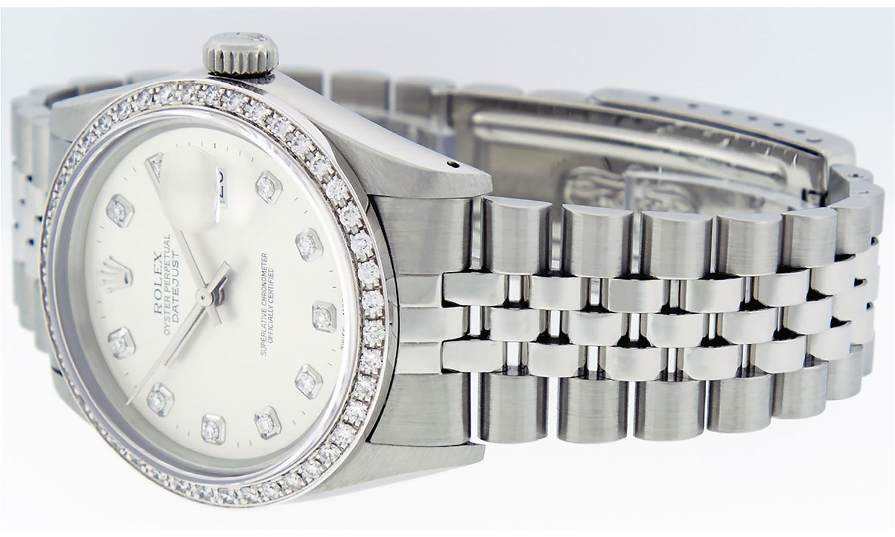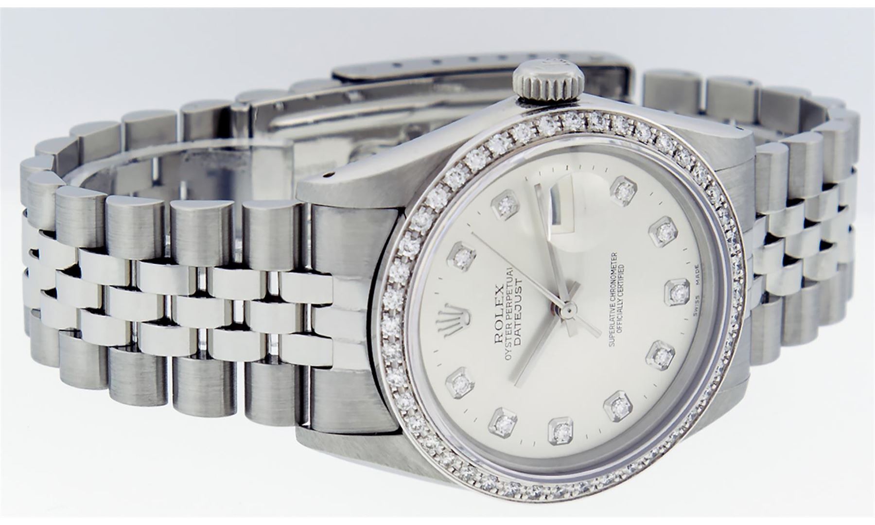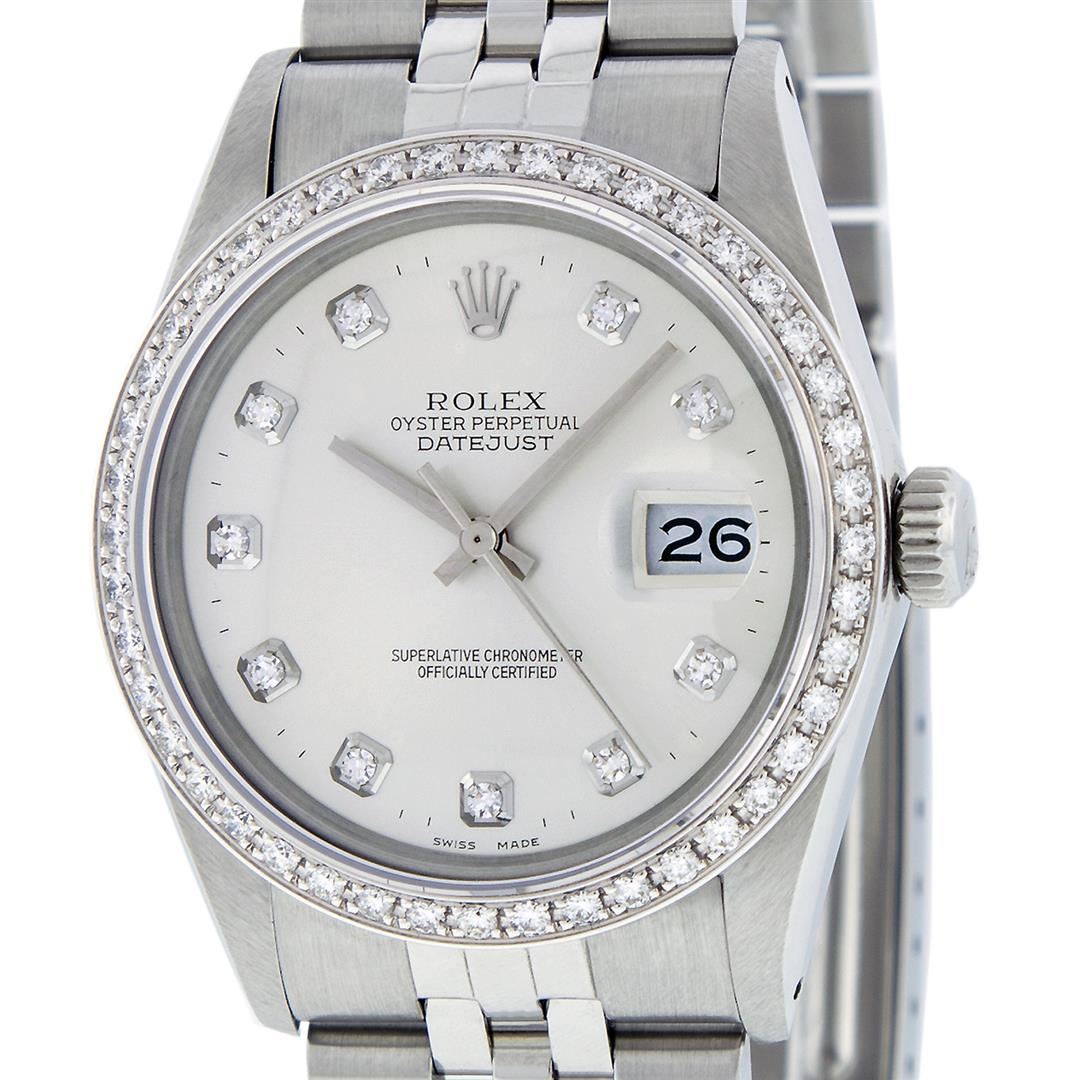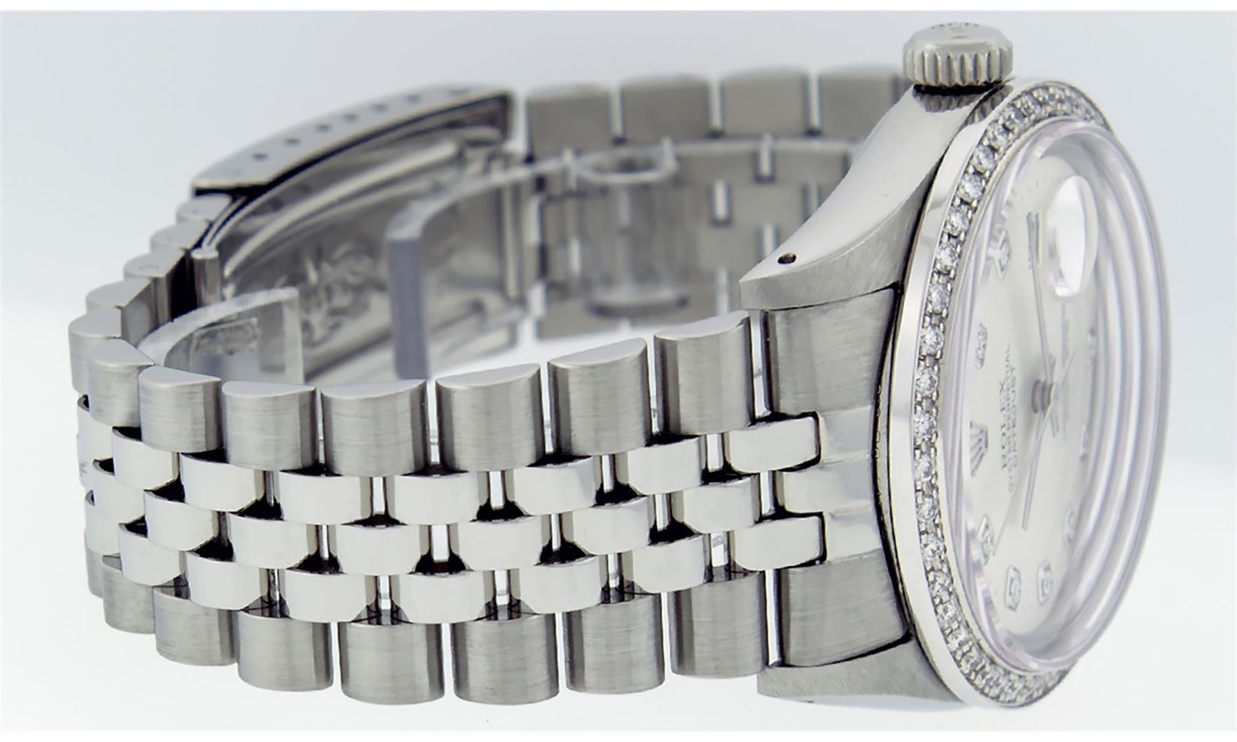 One Mens Pre Owned Stainless Steel Rolex Datejust Polished, Serviced & Electronically Tested, Rolex Stainless Steel Case: 36mm, Rolex Stainless Steel Crown, Custom Bezel: New 18K White Gold Bead set Diamond Bezel, Diamond Count: 44 Diamonds In Bezel, Clar