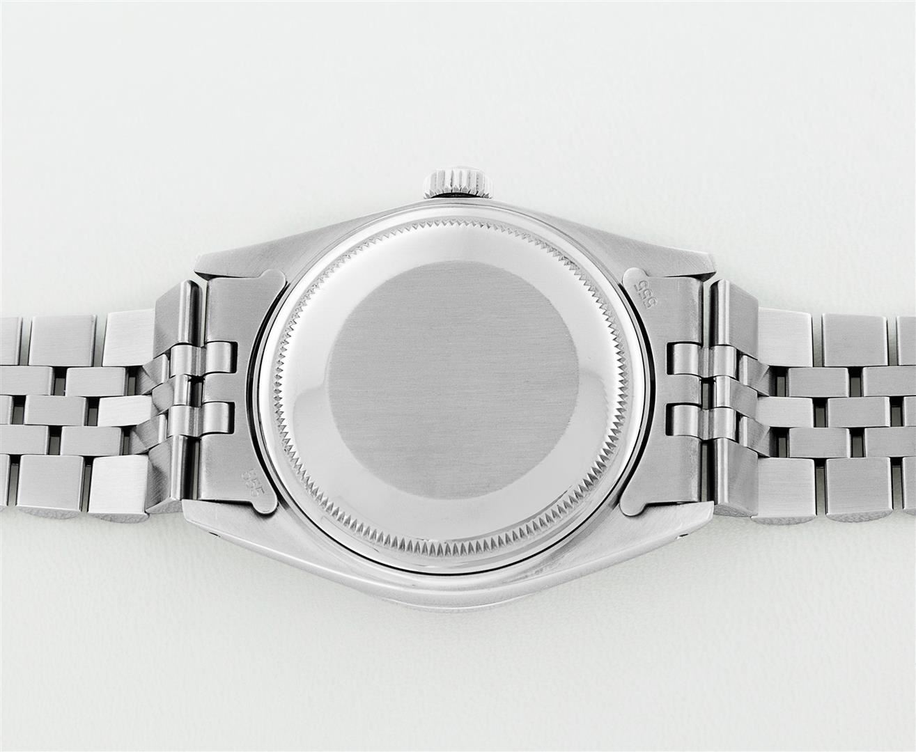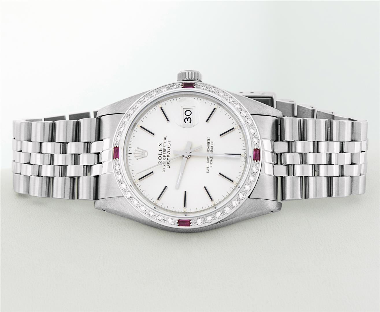 One Mens Pre Owned Stainless Steel Rolex Datejust Polished Bright with Satin Finish, This Watch Has Been Serviced & Electronically Tested, Rolex Stainless Steel Case: 36mm, Rolex Stainless Steel Crown, Custom Bezel: New 18K White Gold Ruby Beadset Diamond Bezel, Diamond + Gem Count: 36 Diamonds + 4 Rubies, Total Weight 1.00 Carat, Clarity: SI-VS, Color: G to H. Custom Crystal: New Sapphire With Magnified Date Window. Custom Hands: New Luminescent Hands. Rolex Movement: Automatic Winding Movement 3035. Rolex Dial: Silver Index With Dash Track & Lumi Dots. Date Window: 3 O'Clock Position Date Display, Quickset, Model: Datejust, Condition: G-6 Extra Fine. Rolex Bracelet: Stainless Steel Jubilee Band. Bracelet: 7.0 Inch Length, Adjustable. Standard Clasp, With Rolex Logo. This Watch Has Been Serviced Time Tested And Is In Excellent Condition It Is Free Of All Scratches And Dents.