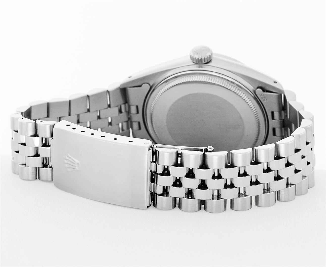 One Mens Pre Owned Stainless Steel Rolex Datejust Polished Bright with Satin Finish, This Watch Has Been Serviced & Electronically Tested, Rolex Stainless Steel Case: 36mm, Rolex Stainless Steel Crown, Custom Bezel: New 18K White Gold Sapphire Beadset Diamond Bezel, Diamond + Gem Count: 36 Diamonds + 4 Sapphires, Total Weight 1.00 Carat, Clarity: SI-VS, Color: G to H. Custom Crystal: New Sapphire With Magnified Date Window. Custom Hands: New Luminescent Hands. Rolex Movement: Automatic Winding Movement 3035. Rolex Dial: Silver Index With Dash Track & Lumi Dots. Date Window: 3 O'Clock Position Date Display, Quickset, Model: Datejust, Condition: G-6 Extra Fine. Rolex Bracelet: Stainless Steel Jubilee Band. Bracelet: 7.0 Inch Length, Adjustable. Standard Clasp, With Rolex Logo. This Watch Has Been Serviced Time Tested And Is In Excellent Condition It Is Free Of All Scratches And Dents.