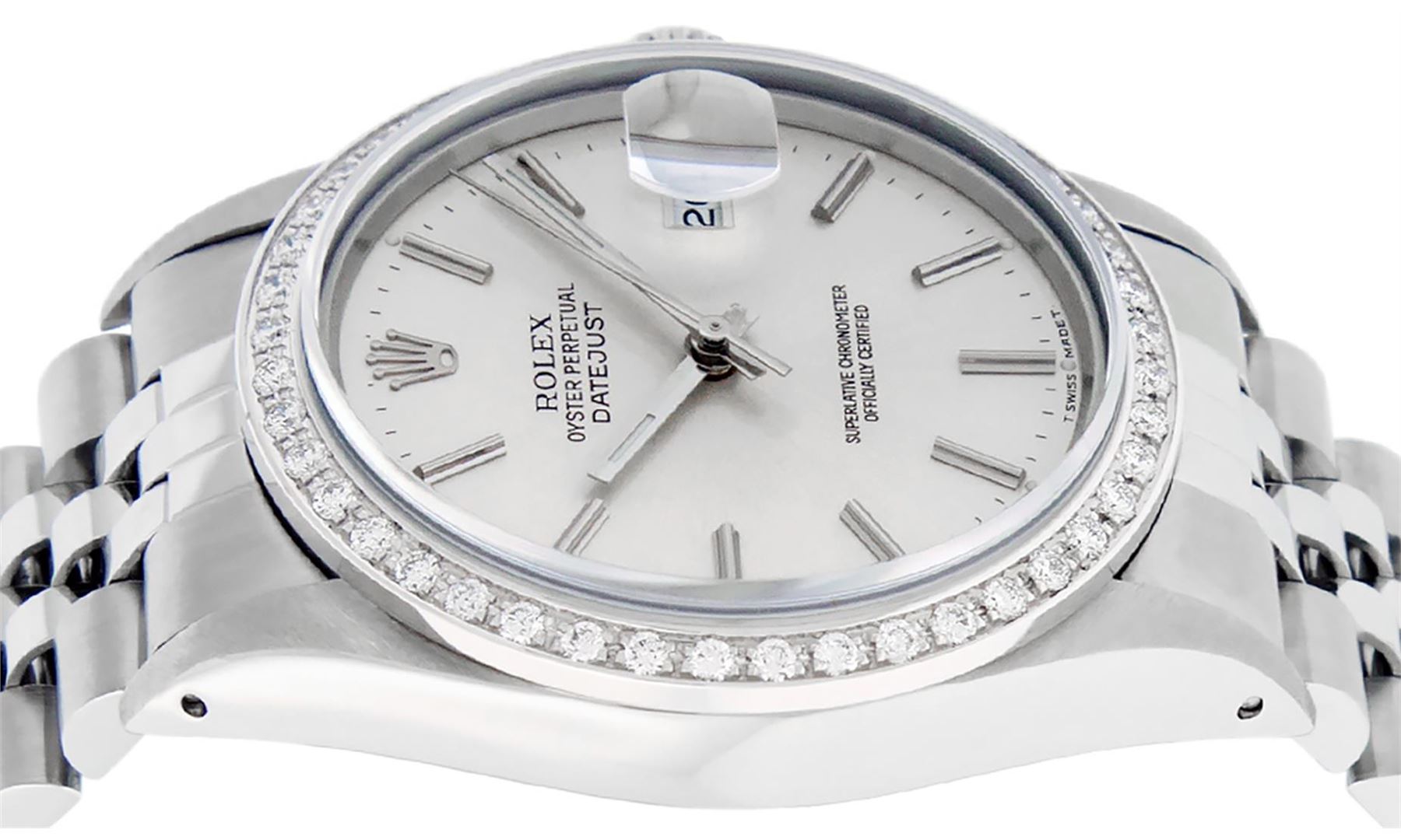 One Mens Pre Owned Stainless Steel Rolex Datejust Polished Bright with Satin Finish, This Watch Has Been Serviced & Electronically Tested, Rolex Stainless Steel Case: 36mm, Rolex Stainless Steel Crown, Custom Bezel: New 18K White Gold Beadset Diamond Bezel, Diamond Count: 44 Diamonds, Total Weight 1.00 Carat, Clarity: SI-VS, Color: G to H. Custom Crystal: New Sapphire With Magnified Date Window. Custom Hands: New Luminescent Hands. Rolex Movement: Automatic Winding Movement 3035. Rolex Dial: Silver Index With Dash Track & Lumi Dot. Date Window: 3 O'Clock Position Date Display, Quickset, Model: Datejust, Condition: G-6 Extra Fine. Rolex Bracelet: Stainless Steel Jubilee Band. Bracelet: 7.0 Inch Length, Adjustable. Standard Clasp, With Rolex Logo. This Watch Has Been Serviced Time Tested And Is In Excellent Condition It Is Free Of All Scratches And Dents.