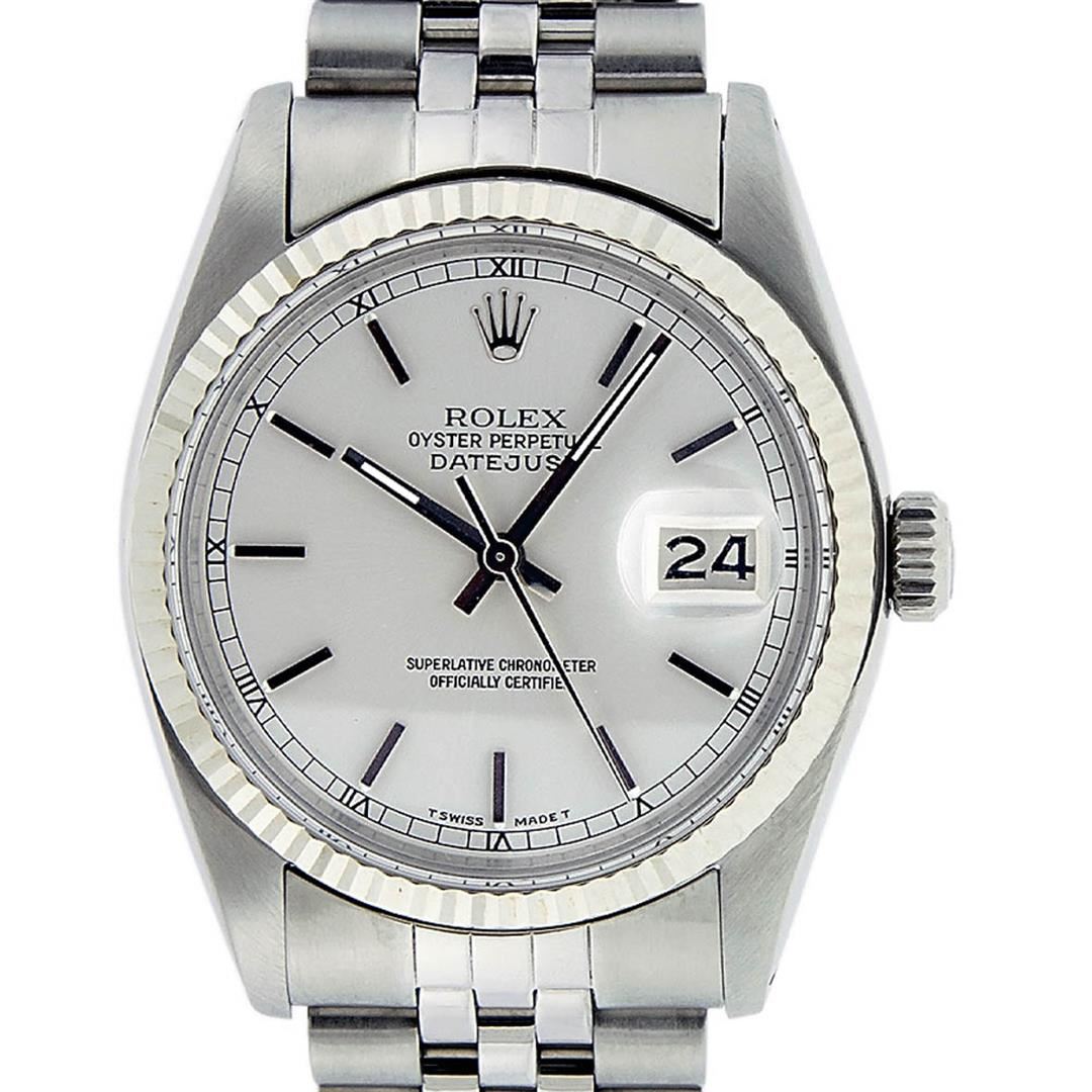 One Gents Rolex Datejust Polished, Serviced & Electronically Tested, Stainless Steel Case:36mm, Stainless Steel Crown, Bezel: 14K White Gold Fluted Bezel. Custom Crystal: Acrylic Cyclops Lens. Movement: Automatic Winding Movement Caliber 3035. Dial: Silver Index With Square Roman Track And Lumi Dots. Date Window: 3 O'Clock Position Date Display, Quickset, Model: Datejust. Condition: G-6 Extra Fine. Bracelet: Stainless Steel Jubilee. Bright Polish & Satin Finish. 7.0 Inch Length, Adjustable. Standard Clasp, With Rolex Logo.