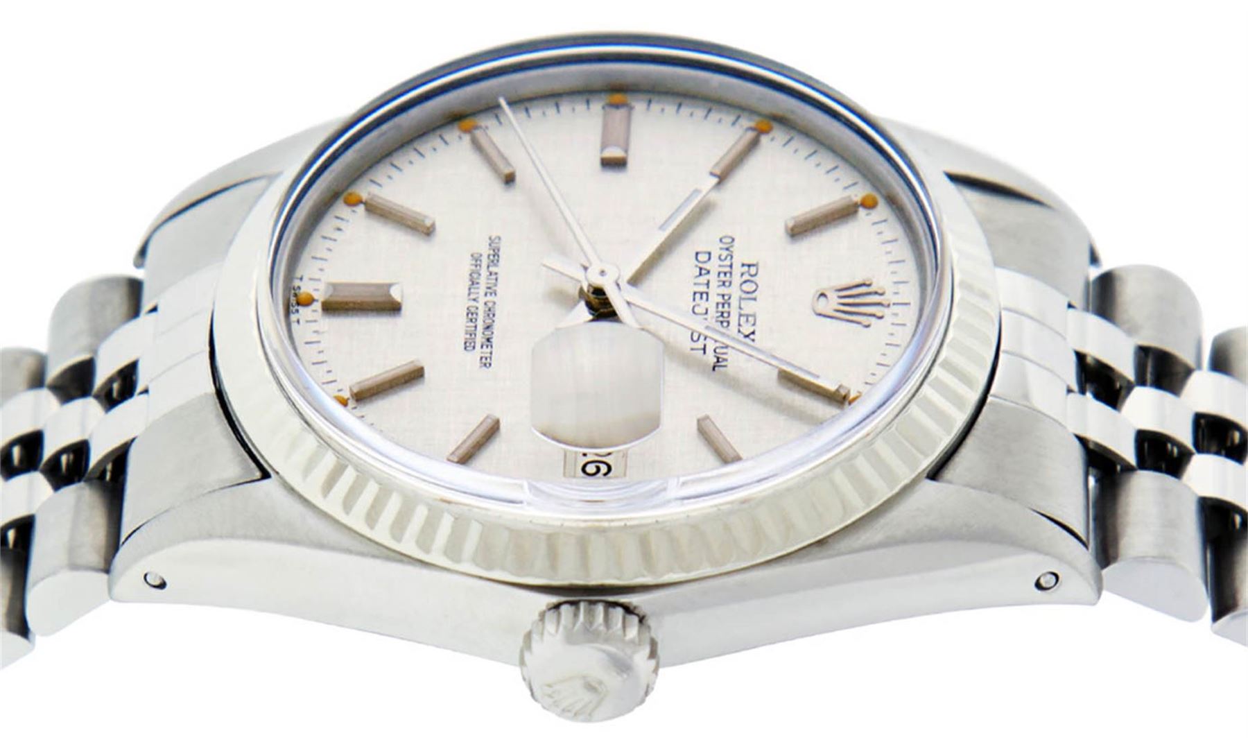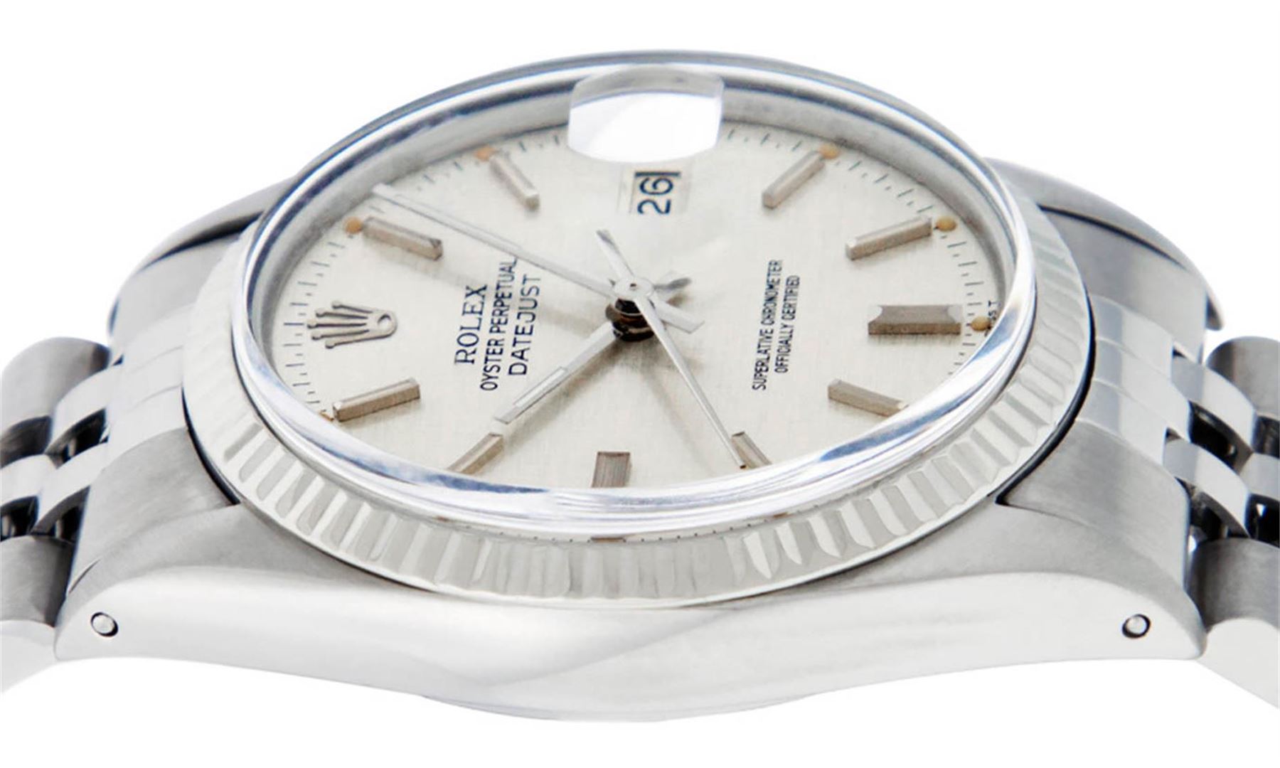 One Mens Rolex Datejust Polished, Serviced & Electronically Tested, Stainless Steel Case:36mm, Stainless Steel Crown, Bezel: 14K White Gold Fluted Bezel. Custom Crystal: Acrylic Cyclops Lens. Custom Hands: New Luminecent Hands.Movement: Automatic Winding Movement Caliber 3035. Dial: Silver Index With Lumi Dots. Date Window: 3 O'Clock Position Date Display, Quickset, Model: Datejust. Condition: G-6 Extra Fine. Bracelet: Rolex Stainless Steel Jubilee. Bright Polish & Satin Finish. 7.0 Inch Length, Adjustable. Standard Clasp, With Rolex Logo. This watch has been serviced and polished and its free of all dents and scratches and has been time tested.