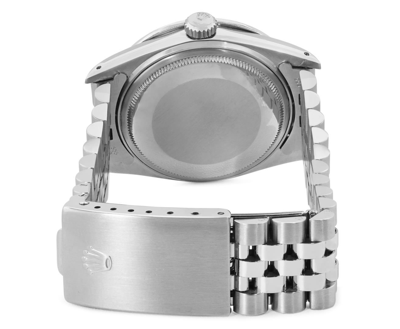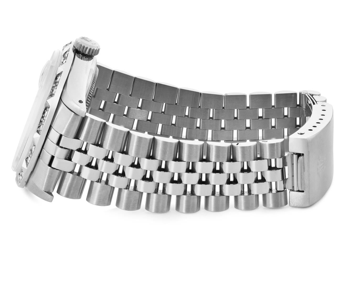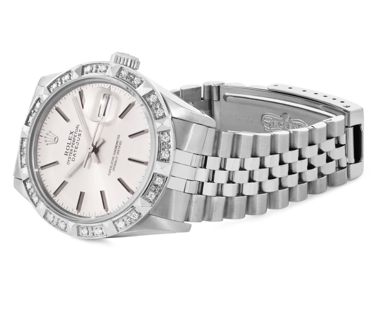 One Mens Pre Owned Rolex Stainless Steel Datejust Polished Bright with Satin Finish, Serviced And Electronically Tested, Rolex Stainless Steel Case: 36mm, Rolex Stainless Steel Crown, Custom Bezel: New 18K White Gold Pyramid Bezel, Diamond Count: 24 Diamond on Bezel. Custom Crystal: New Sapphire With Magnified Date Window. Rolex Movement: Automatic Winding Movement Caliber 3035. Rolex Dial: Silver Index Dial With Open Track and Lumi Dots. Custom Hands: New Lumi Hands. Date Window: 3 O'Clock Position Date Display, Quickset, Model: Quickset Datejust. Condition: G-6 Extra Fine. Rolex Bracelet: Stainless Steel Jubilee Band. Bright Polish And Satin Finish. 7.0 Inch Length, Adjustable. Fold Clasp, With Rolex Logo. This Watch Has Been Serviced Time Tested And Is In Excellent Condition It Is Free Of All Scratches And Dents. This Watch Comes With A Rolex Box.