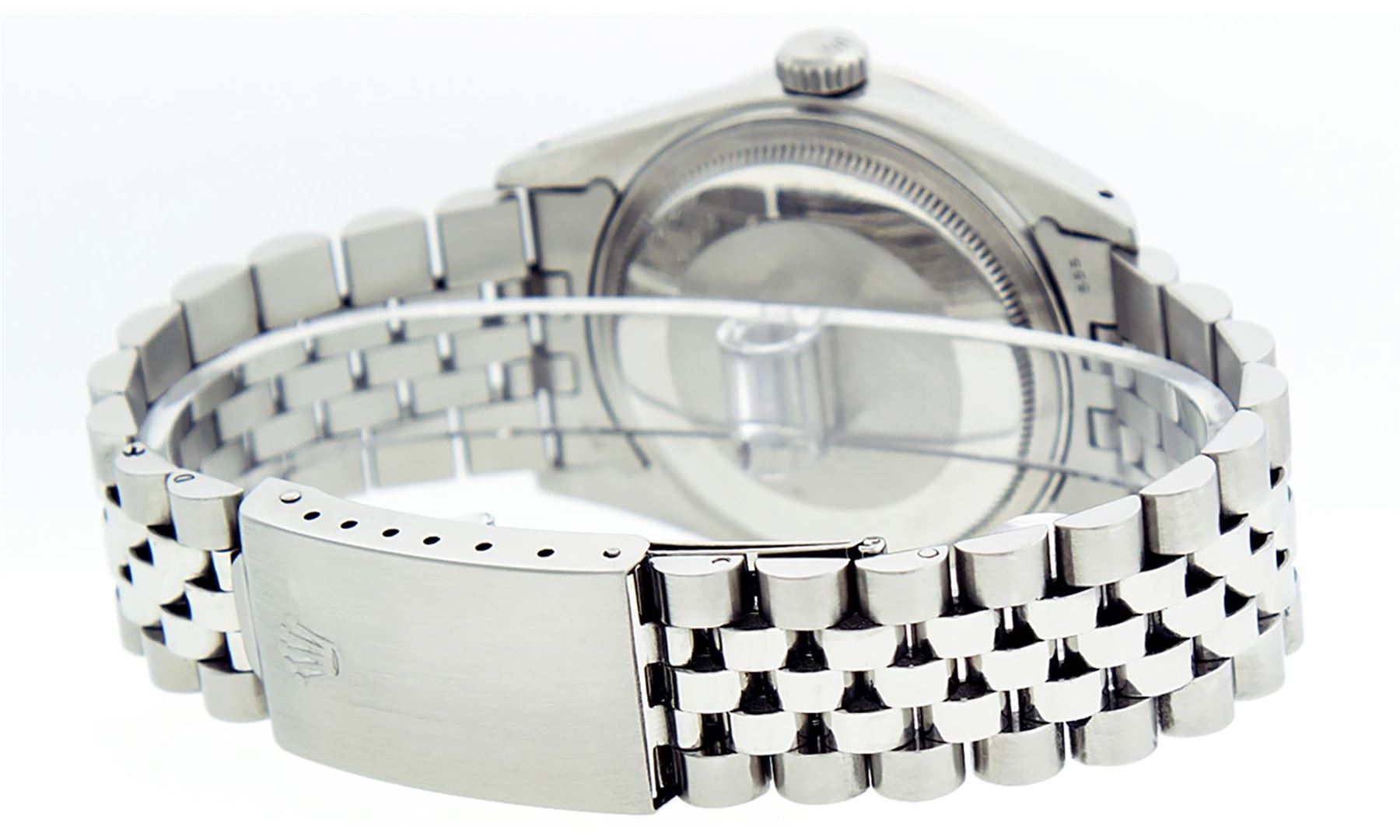 One Mens Pre Owned Stainless Steel Rolex Datejust Polished Bright with Satin Finish, This Watch Has Been Serviced & Electronically Tested, Rolex Stainless Steel Case: 36mm, Rolex Stainless Steel Crown, Custom Bezel: New 18K White Gold Emerald Beadset Diamond Bezel, Diamond + Gem Count: 36 Diamonds + 4 Emeralds, Total Weight 1.00 Carat, Clarity: SI-VS, Color: G to H. Custom Crystal: New Sapphire With Date Window. Custom Hands: New Luminescent Hands. Rolex Movement: Automatic Winding Movement 3035. Rolex Dial: Silver Index With Dash Track & Lumi Dots. Date Window: 3 O'Clock Position Date Display, Quickset, Model: Datejust, Condition: G-6 Extra Fine. Rolex Bracelet: Stainless Steel Jubilee Band. Bracelet: 7.0 Inch Length, Adjustable. Standard Clasp, With Rolex Logo. This Watch Has Been Serviced Time Tested And Is In Excellent Condition It Is Free Of All Scratches And Dents.
