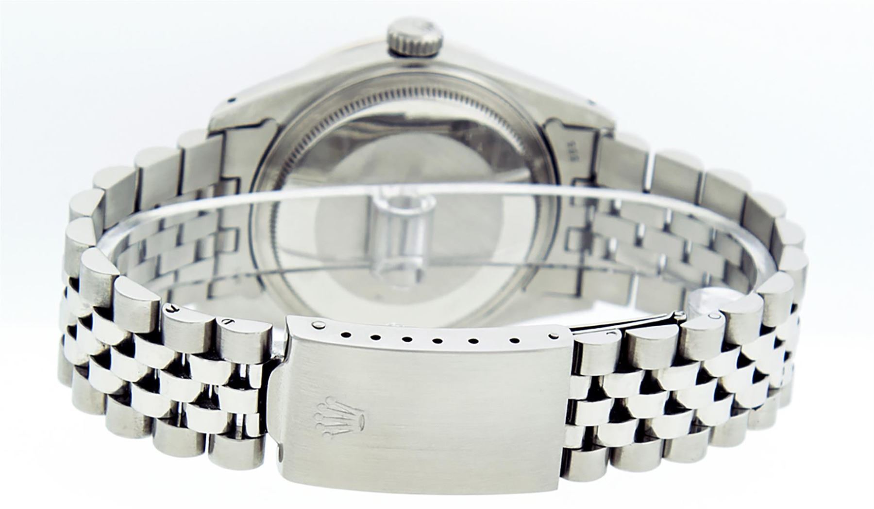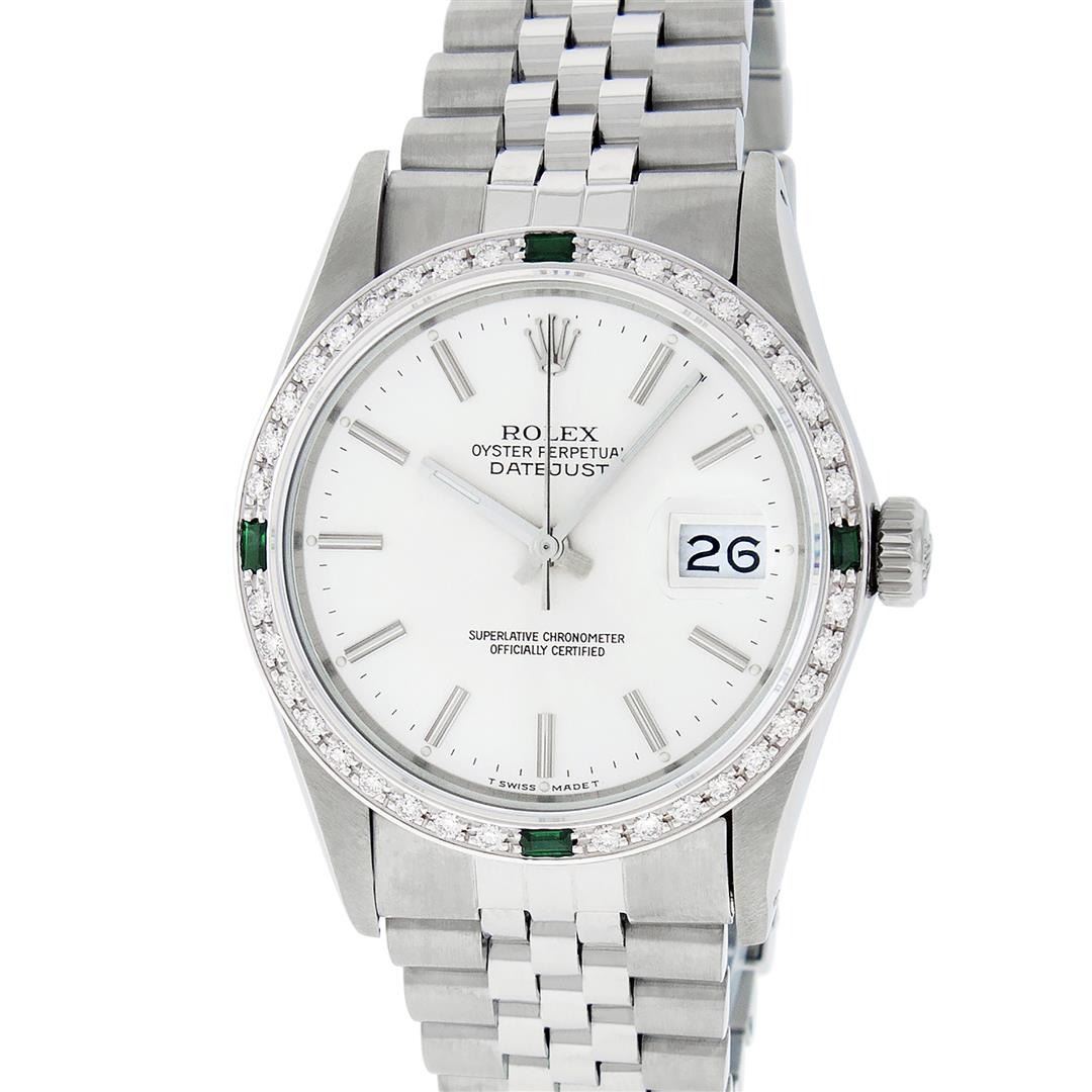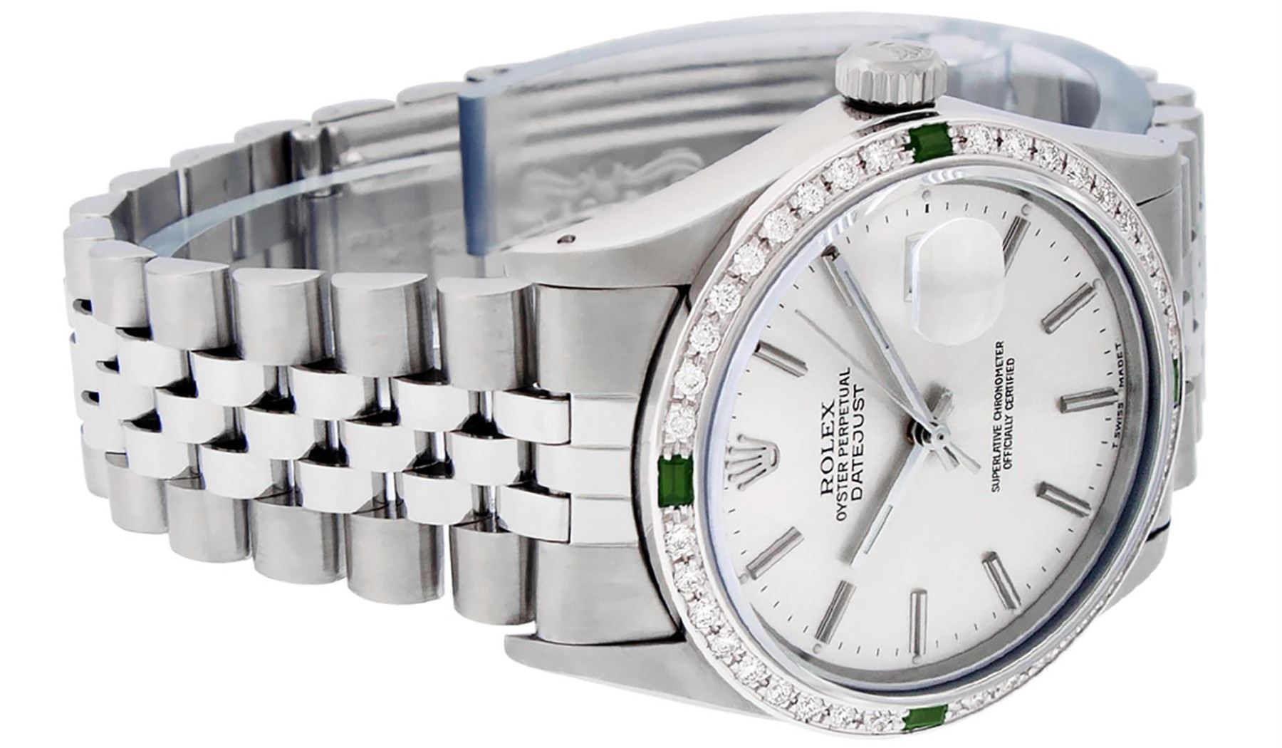 One Mens Pre Owned Stainless Steel Rolex Datejust Polished Bright with Satin Finish, This Watch Has Been Serviced & Electronically Tested, Rolex Stainless Steel Case: 36mm, Rolex Stainless Steel Crown, Custom Bezel: New 18K White Gold Emerald Beadset Diamond Bezel, Diamond + Gem Count: 36 Diamonds + 4 Emeralds, Total Weight 1.00 Carat, Clarity: SI-VS, Color: G to H. Custom Crystal: New Sapphire With Date Window. Custom Hands: New Luminescent Hands. Rolex Movement: Automatic Winding Movement 3035. Rolex Dial: Silver Index With Dash Track & Lumi Dots. Date Window: 3 O'Clock Position Date Display, Quickset, Model: Datejust, Condition: G-6 Extra Fine. Rolex Bracelet: Stainless Steel Jubilee Band. Bracelet: 7.0 Inch Length, Adjustable. Standard Clasp, With Rolex Logo. This Watch Has Been Serviced Time Tested And Is In Excellent Condition It Is Free Of All Scratches And Dents.