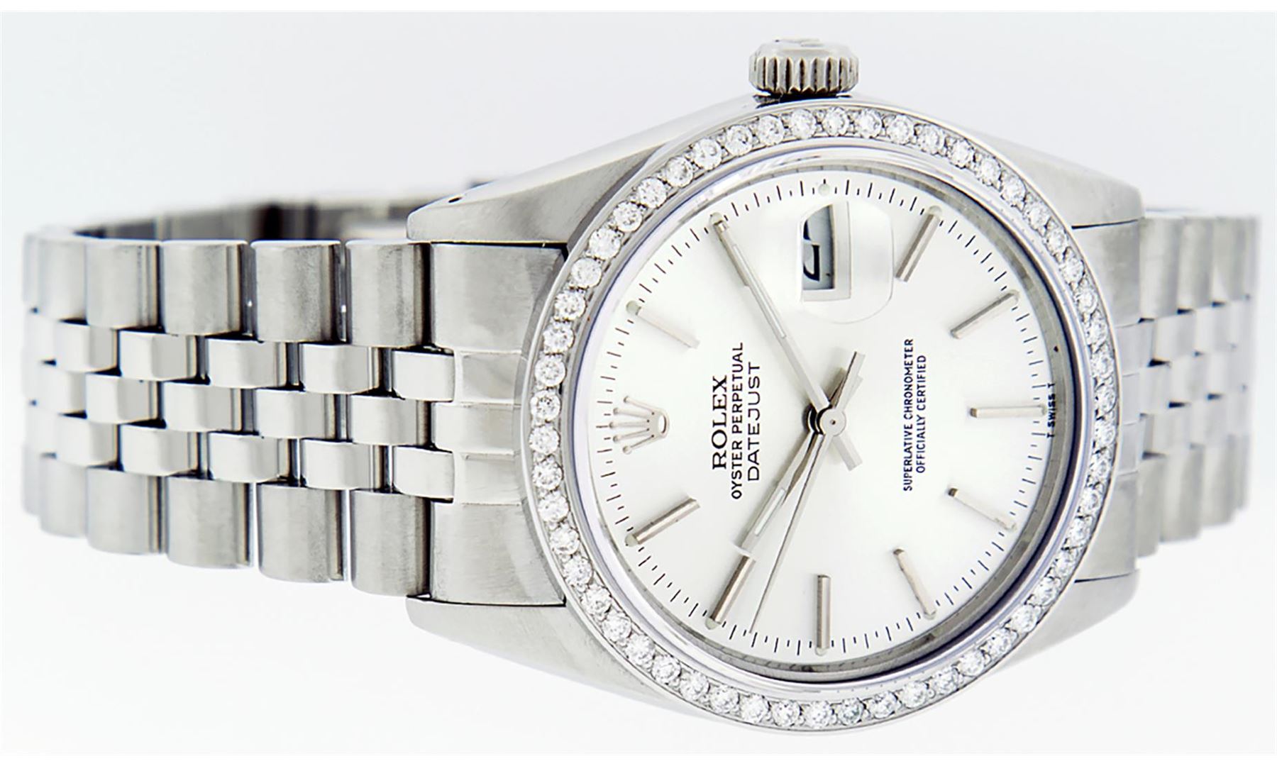 One Mens Pre Owned Rolex Stainless Steel Datejust Polished Bright with Satin Finish, This Watch Has Been Serviced & Electronically Tested, Stainless Steel Case: 36mm, Rolex Stainless Steel Crown, Custom Bezel: New Stainless Steel Beadset Diamond Bezel, Diamond Count: 54 Diamonds, Total Weight 1.00 Carat, Clarity: SI-VS, Color: G to H. Custom Crystal: New Sapphire With Magnified Date Window. Custom Hands: New Luminescent Hands. Rolex Movement: Automatic Winding Movement 3035. Rolex Dial: Silver Index Dial With Lumi Dots & Dash Track. Date Window: 3 O'Clock Position Date Display, Quickset, Model: Datejust. Condition: G-6 Extra Fine. Rolex Bracelet: Stainless Steel Jubilee Band. Bright Polish & Satin Finish. 7.0 Inch Length, Adjustable. Standard Clasp, With Rolex Logo. This Watch Has Been Serviced Time Tested And Is In Excellent Condition It Is Free Of All Scratches And Dents.