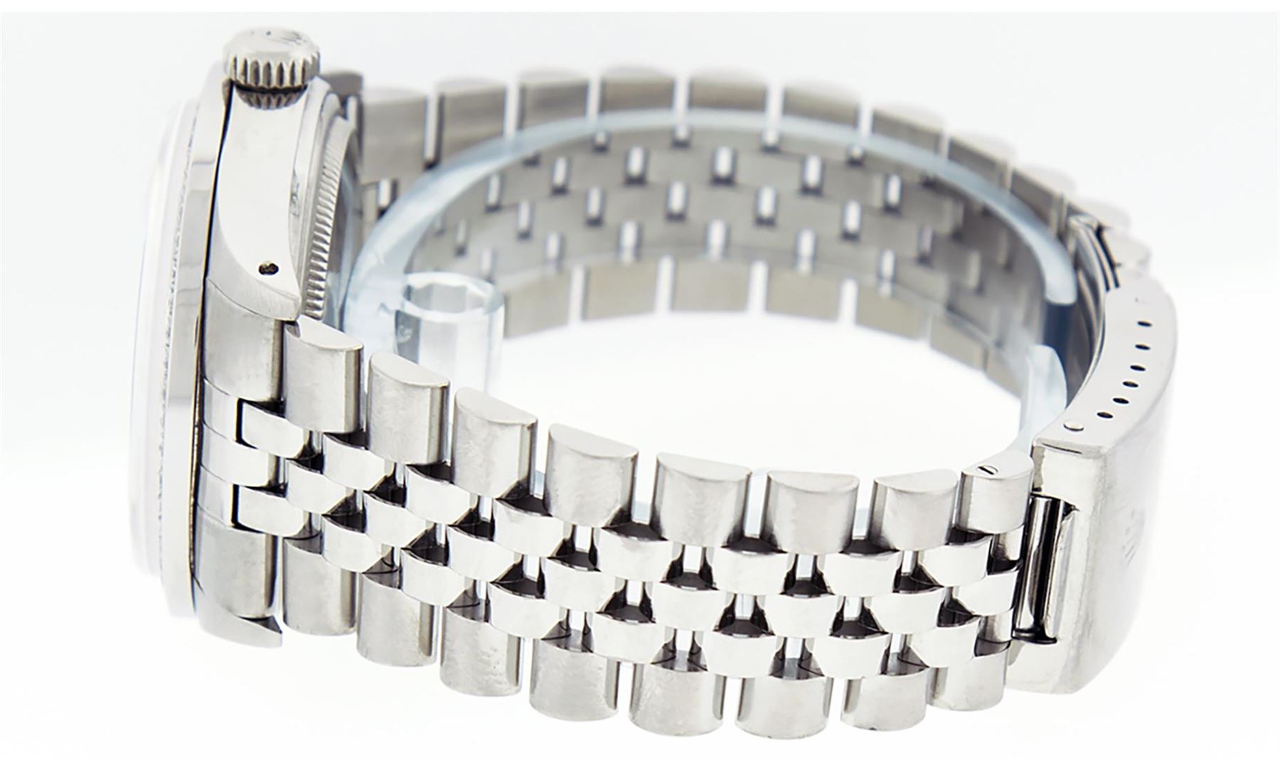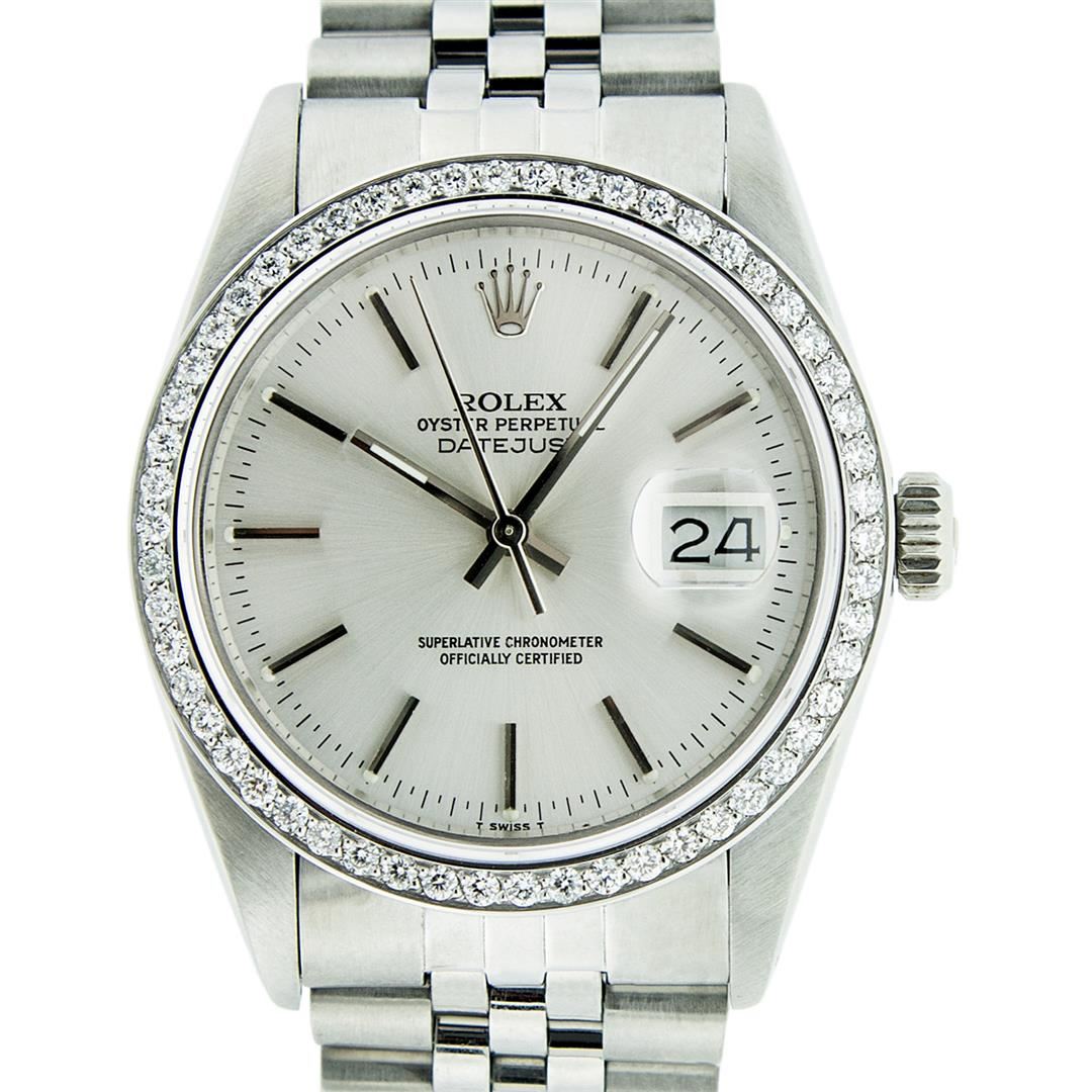One Mens Pre Owned Rolex Stainless Steel Datejust Polished Bright with Satin Finish, This Watch Has Been Serviced & Electronically Tested, Stainless Steel Case: 36mm, Rolex Stainless Steel Crown, Custom Bezel: New Stainless Steel Beadset Diamond Bezel, Diamond Count: 54 Diamonds, Total Weight 1.00 Carat, Clarity: SI-VS, Color: G to H. Custom Crystal: New Sapphire With Magnified Date Window. Custom Hands: New Luminescent Hands. Rolex Movement: Automatic Winding Movement 3035. Rolex Dial: Silver Index Dial With Lumi Dots & Dash Track. Date Window: 3 O'Clock Position Date Display, Quickset, Model: Datejust. Condition: G-6 Extra Fine. Rolex Bracelet: Stainless Steel Jubilee Band. Bright Polish & Satin Finish. 7.0 Inch Length, Adjustable. Standard Clasp, With Rolex Logo. This Watch Has Been Serviced Time Tested And Is In Excellent Condition It Is Free Of All Scratches And Dents.