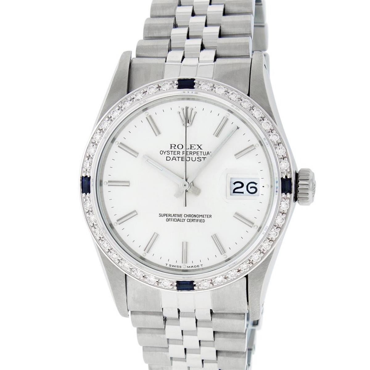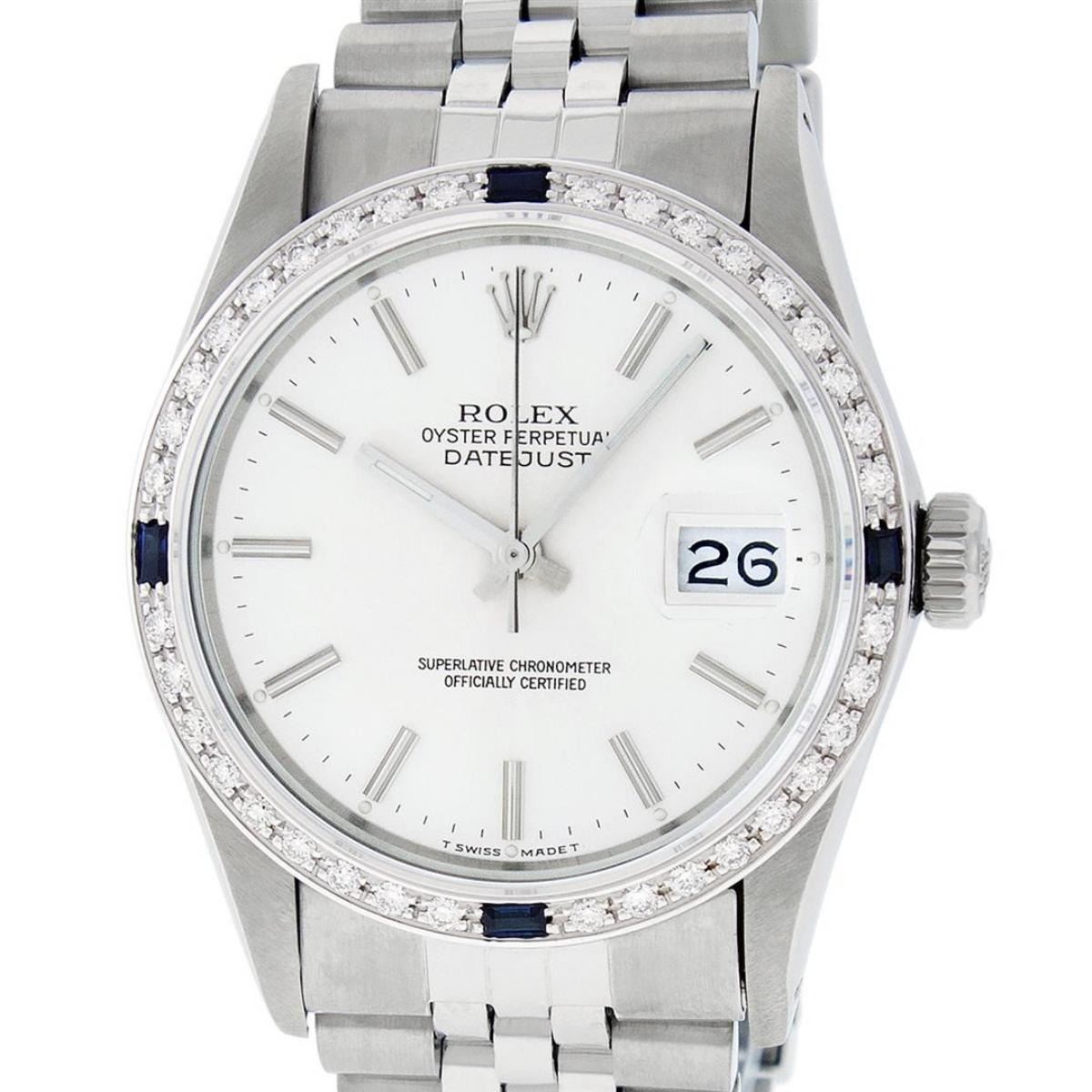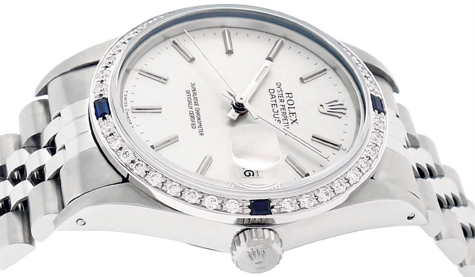 One Mens Stainless Steel Rolex Datejust Polished Bright with Satin Finish, This Watch Has Been Serviced & Electronically Tested, Stainless Steel Case: 36mm, Stainless Steel Crown, Custom Bezel: New 18K White Gold Sapphire Beadset Diamond Bezel, Diamond + Gem Count: 36 Diamonds + 4 Sapphires, Total Weight 1.00 Carat, Clarity: SI-VS, Color: G to H. Custom Crystal: New Synthetic Sapphire Cyclops Lens. Custom Hands: New Luminescent Hands. Movement: Automatic Winding Movement. Dial: Silver Index With Dash Track & Lumi Dots. Date Window: 3 O'Clock Position Date Display, Quickset, Model: Datejust, Condition: G-6 Extra Fine. Bracelet: Stainless Steel Jubilee. Bracelet: 7.0 Inch Length, Adjustable. Standard Clasp, With Rolex Logo. This Watch Has Been Serviced Time Tested And Is In Excellent Condition It Is Free Of All Scratches And Dents.