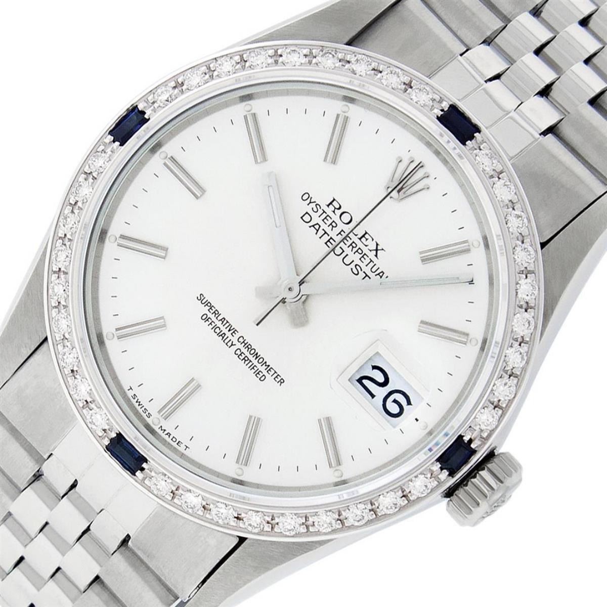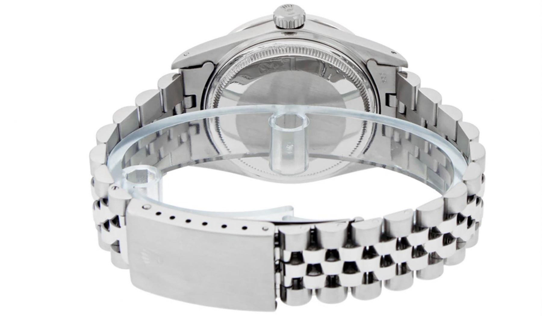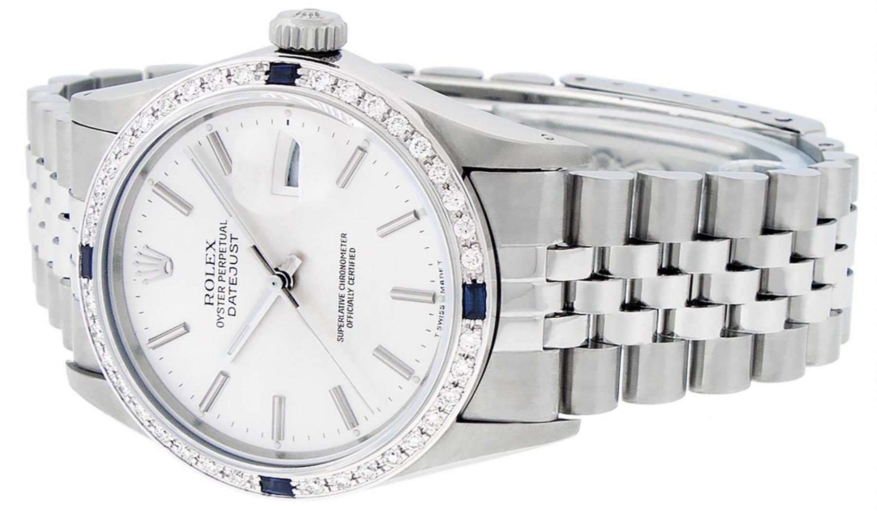 One Mens Stainless Steel Rolex Datejust Polished Bright with Satin Finish, This Watch Has Been Serviced & Electronically Tested, Stainless Steel Case: 36mm, Stainless Steel Crown, Custom Bezel: New 18K White Gold Sapphire Beadset Diamond Bezel, Diamond + Gem Count: 36 Diamonds + 4 Sapphires, Total Weight 1.00 Carat, Clarity: SI-VS, Color: G to H. Custom Crystal: New Synthetic Sapphire Cyclops Lens. Custom Hands: New Luminescent Hands. Movement: Automatic Winding Movement. Dial: Silver Index With Dash Track & Lumi Dots. Date Window: 3 O'Clock Position Date Display, Quickset, Model: Datejust, Condition: G-6 Extra Fine. Bracelet: Stainless Steel Jubilee. Bracelet: 7.0 Inch Length, Adjustable. Standard Clasp, With Rolex Logo. This Watch Has Been Serviced Time Tested And Is In Excellent Condition It Is Free Of All Scratches And Dents.