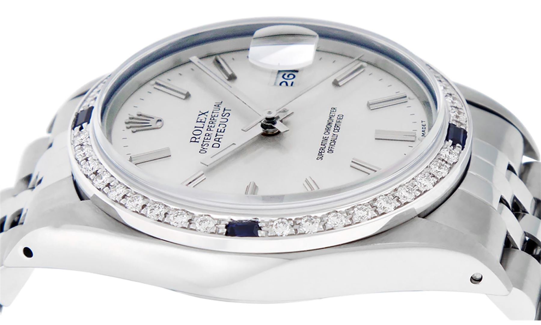 One Mens Pre Owned Stainless Steel Rolex Datejust Polished Bright with Satin Finish, This Watch Has Been Serviced & Electronically Tested, Stainless Steel Case: 36mm, Rolex Stainless Steel Crown, Custom Bezel: New 18K White Gold Sapphire Beadset Diamond Bezel, Diamond + Gem Count: 36 Diamonds + 4 Sapphires, Clarity: SI-VS, Color: G to H. Custom Crystal: New Sapphire With Date Window. Custom Hands: New Luminescent Hands. Rolex Movement: Automatic Winding Movement. Rolex Dial: Silver Index With Dash Track & Lumi Dots. Date Window: 3 O'Clock Position Date Display, Quickset, Model: Datejust, Condition: G-6 Extra Fine. Bracelet: Stainless Steel Jubilee. Bracelet: 7.0 Inch Length, Adjustable. Standard Clasp, With Rolex Logo. This Watch Has Been Serviced Time Tested And Is In Excellent Condition It Is Free Of All Scratches And Dents.