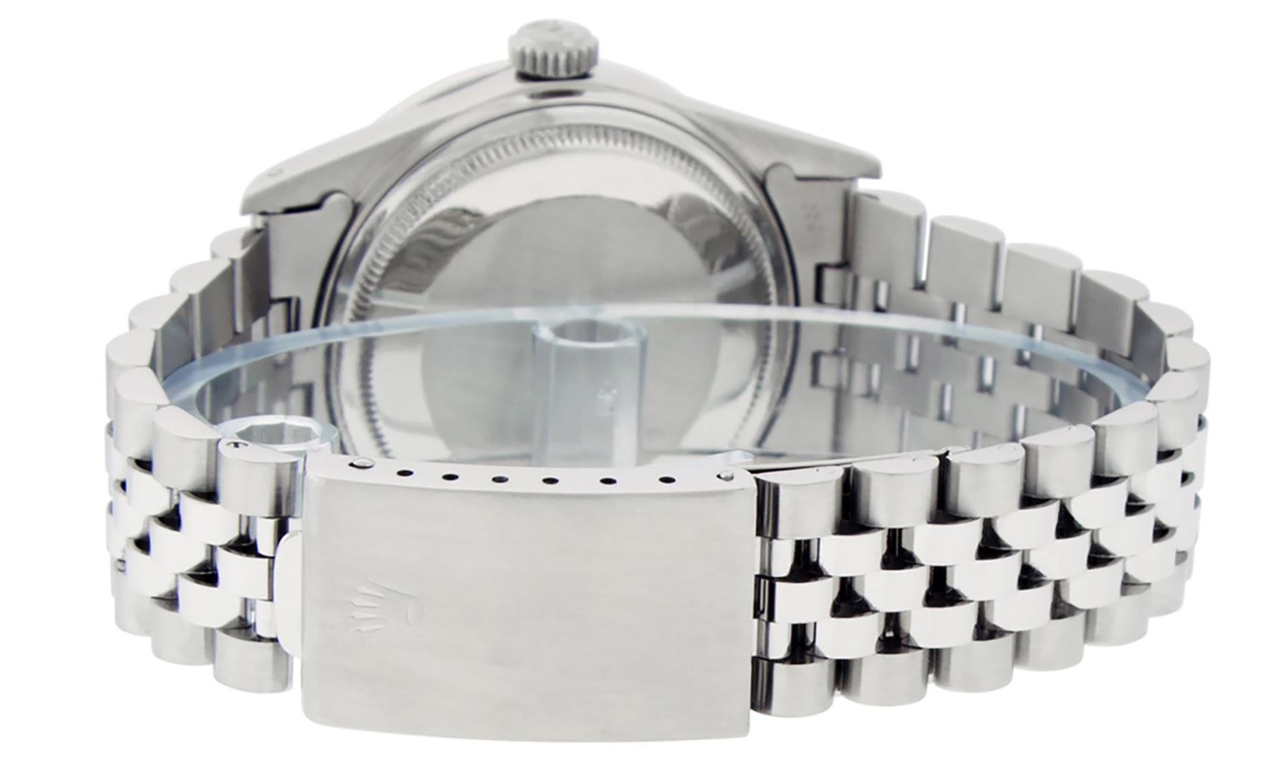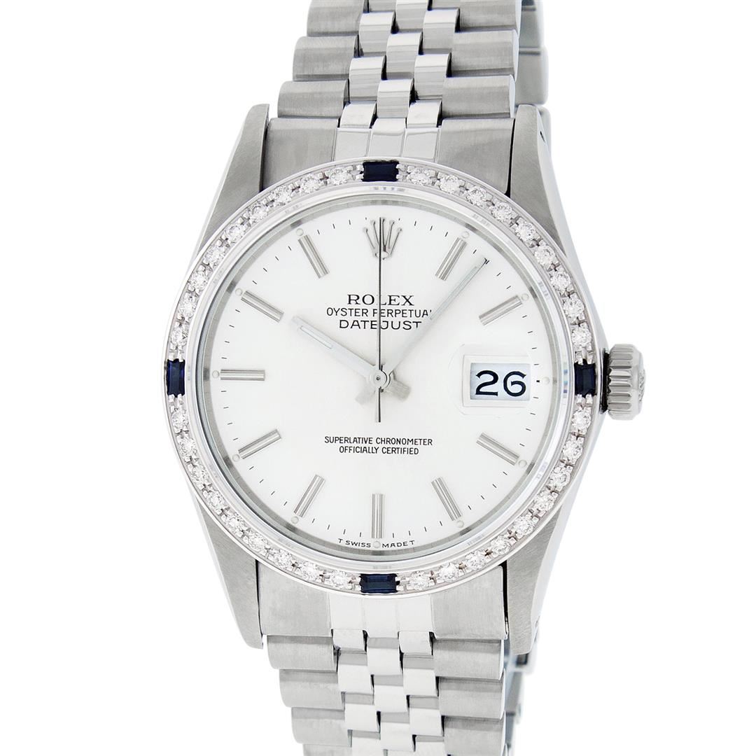 One Mens Pre Owned Stainless Steel Rolex Datejust Polished Bright with Satin Finish, This Watch Has Been Serviced & Electronically Tested, Stainless Steel Case: 36mm, Rolex Stainless Steel Crown, Custom Bezel: New 18K White Gold Sapphire Beadset Diamond Bezel, Diamond + Gem Count: 36 Diamonds + 4 Sapphires, Clarity: SI-VS, Color: G to H. Custom Crystal: New Sapphire With Date Window. Custom Hands: New Luminescent Hands. Rolex Movement: Automatic Winding Movement 3035. Rolex Dial: Silver Index With Dash Track & Lumi Dots. Date Window: 3 O'Clock Position Date Display, Quickset, Model: Datejust, Condition: G-6 Extra Fine. Rolex Bracelet: Stainless Steel Jubilee Band. Bracelet: 7.0 Inch Length, Adjustable. Standard Clasp, With Rolex Logo. This Watch Has Been Serviced Time Tested And Is In Excellent Condition It Is Free Of All Scratches And Dents.